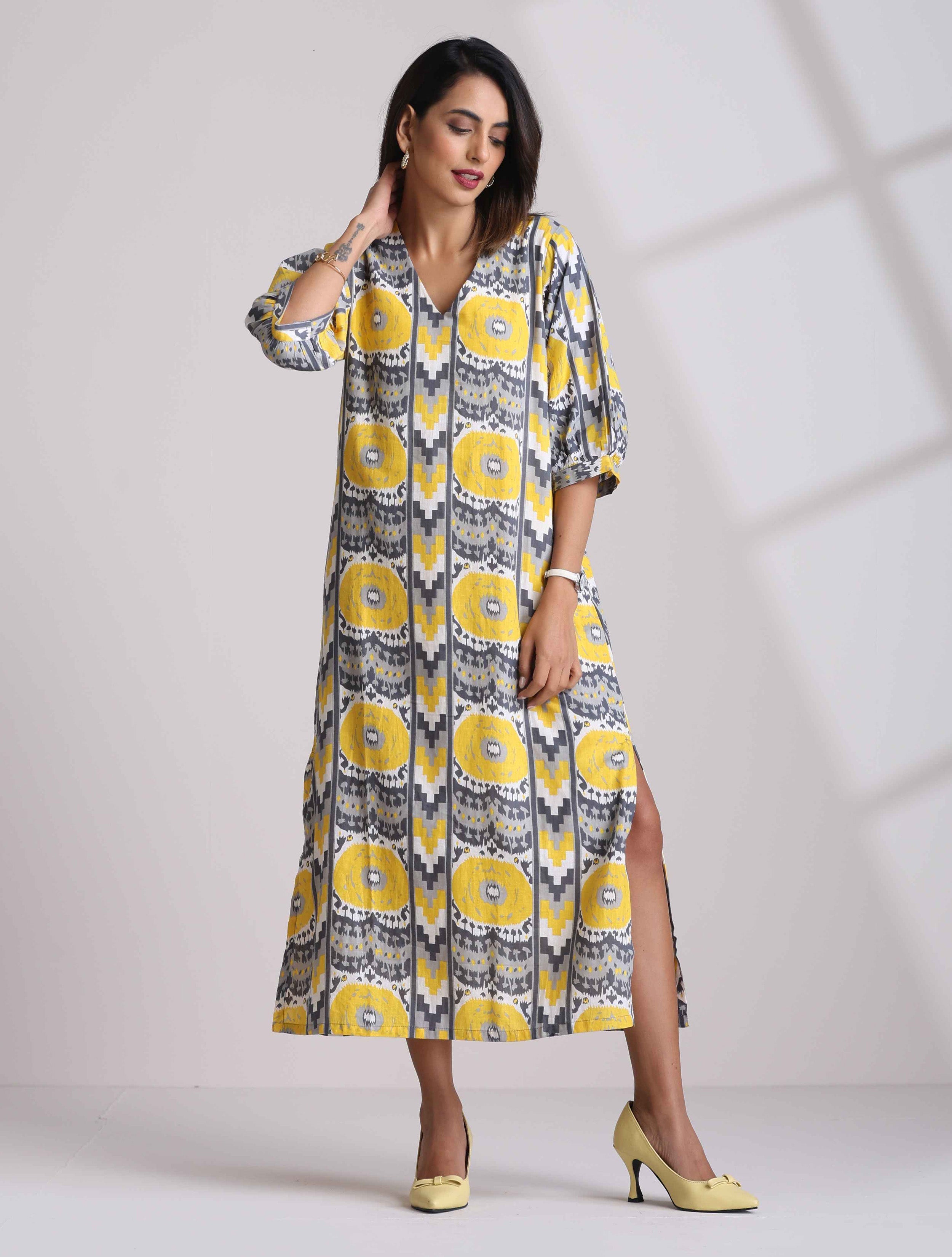 - Cotton Ikat Stripe Printed Dress with puff sleeve, V-neckline and slit.