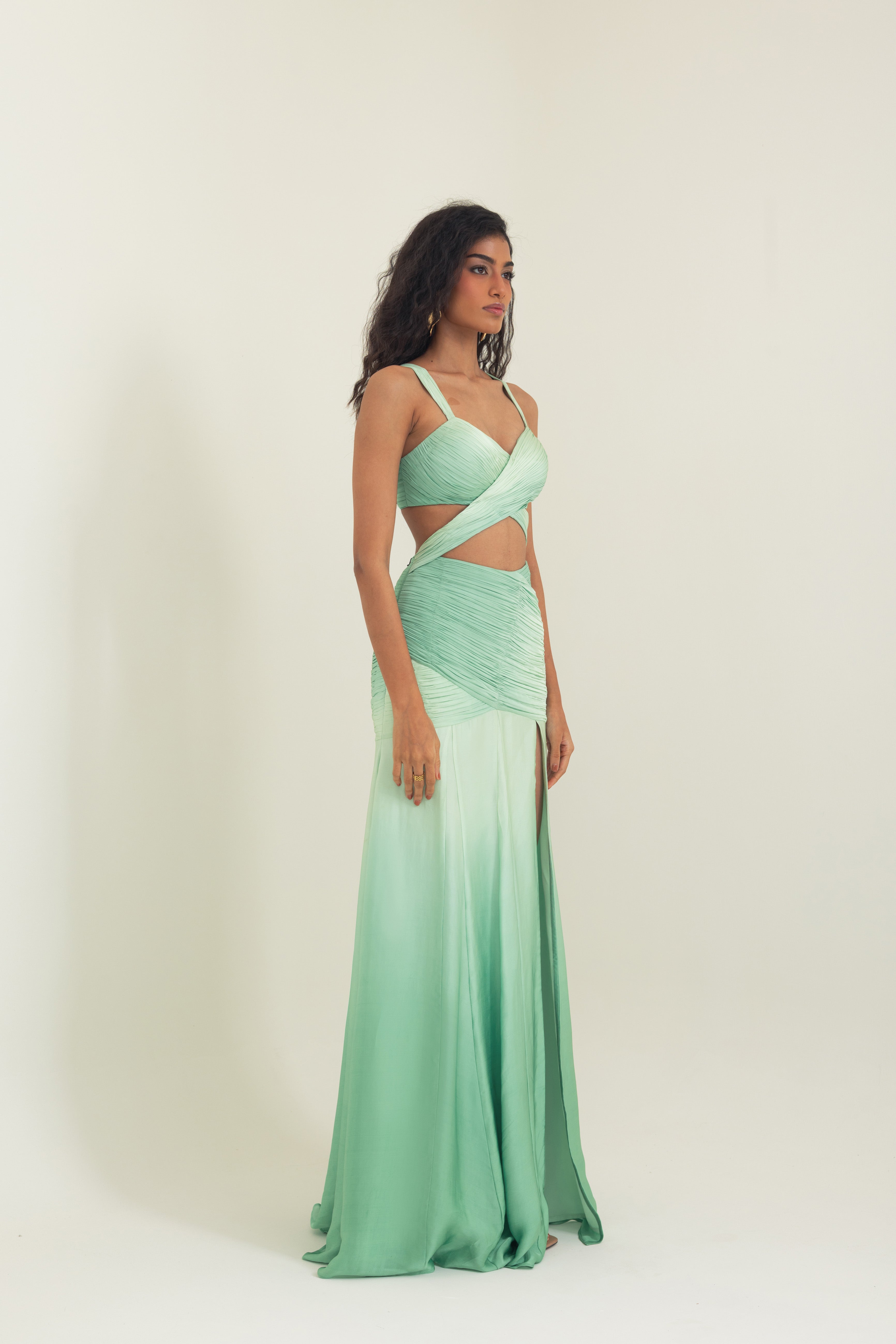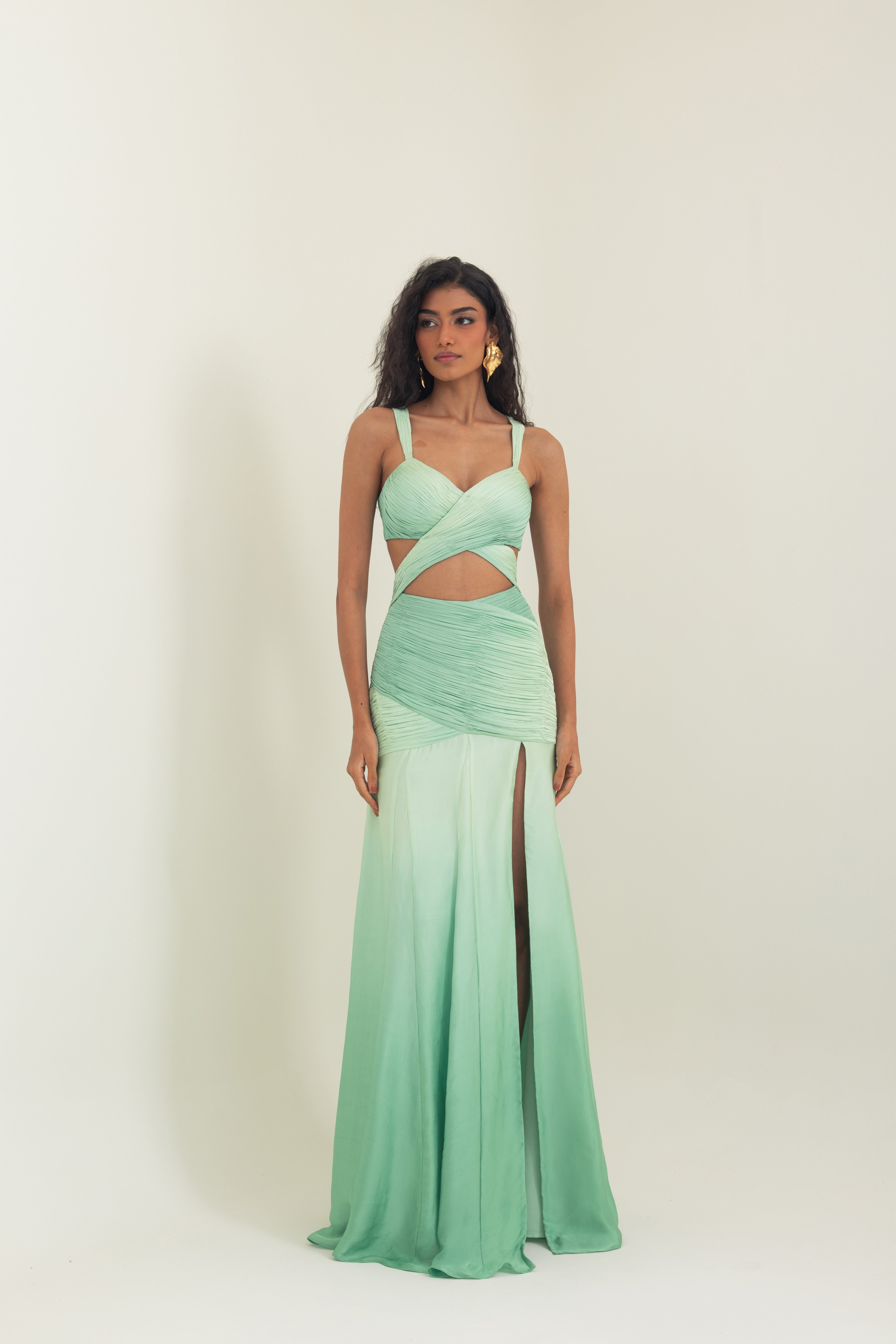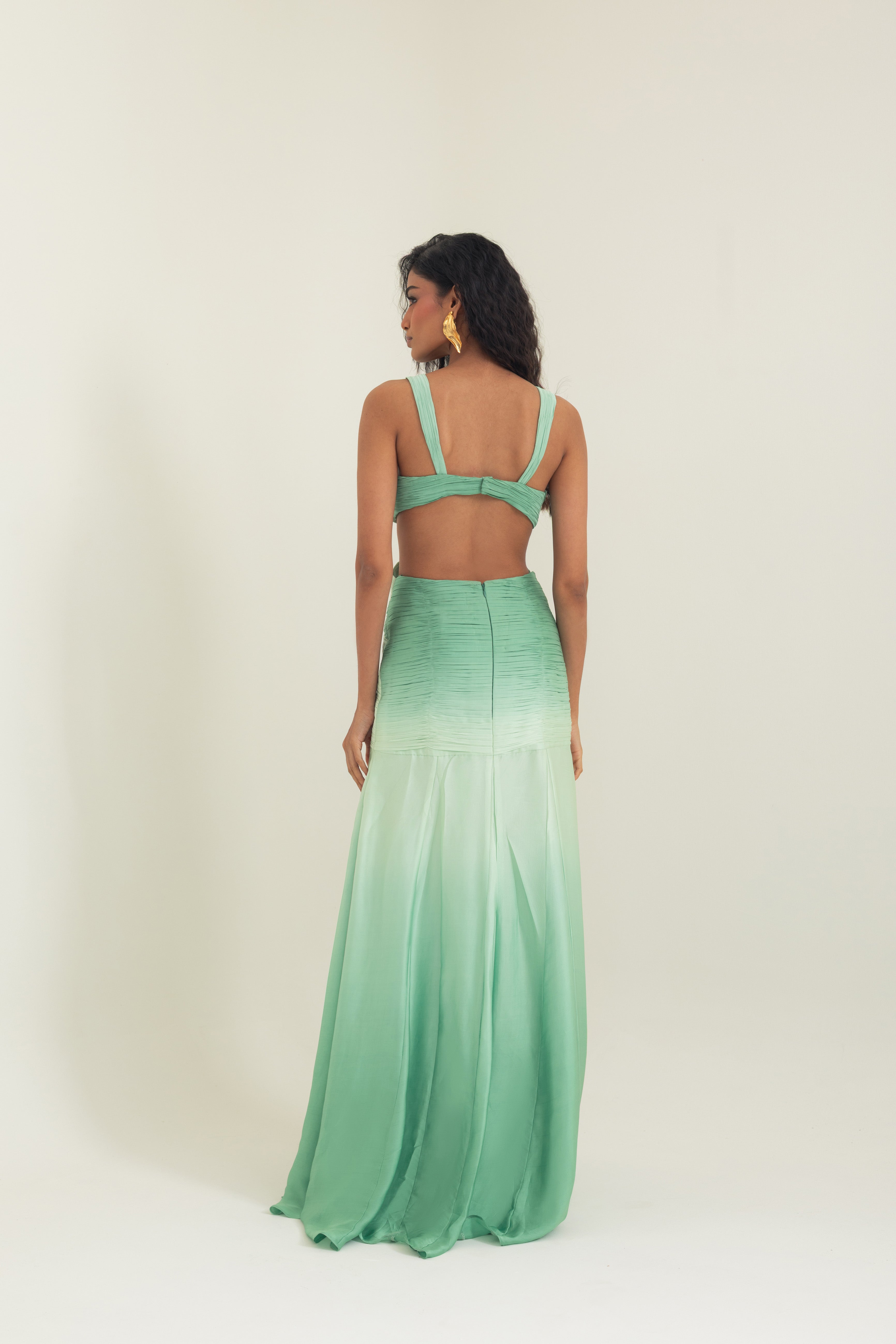 The subtle ombré of green tones flows into a fluid, floor-length skirt with a front slit for ease and movement. A perfect blend of sophistication and edge, ideal for destination weddings , evening soirees and special occasions , where effortless glamour is key, this gown merges timeless artistry with contemporary charm.