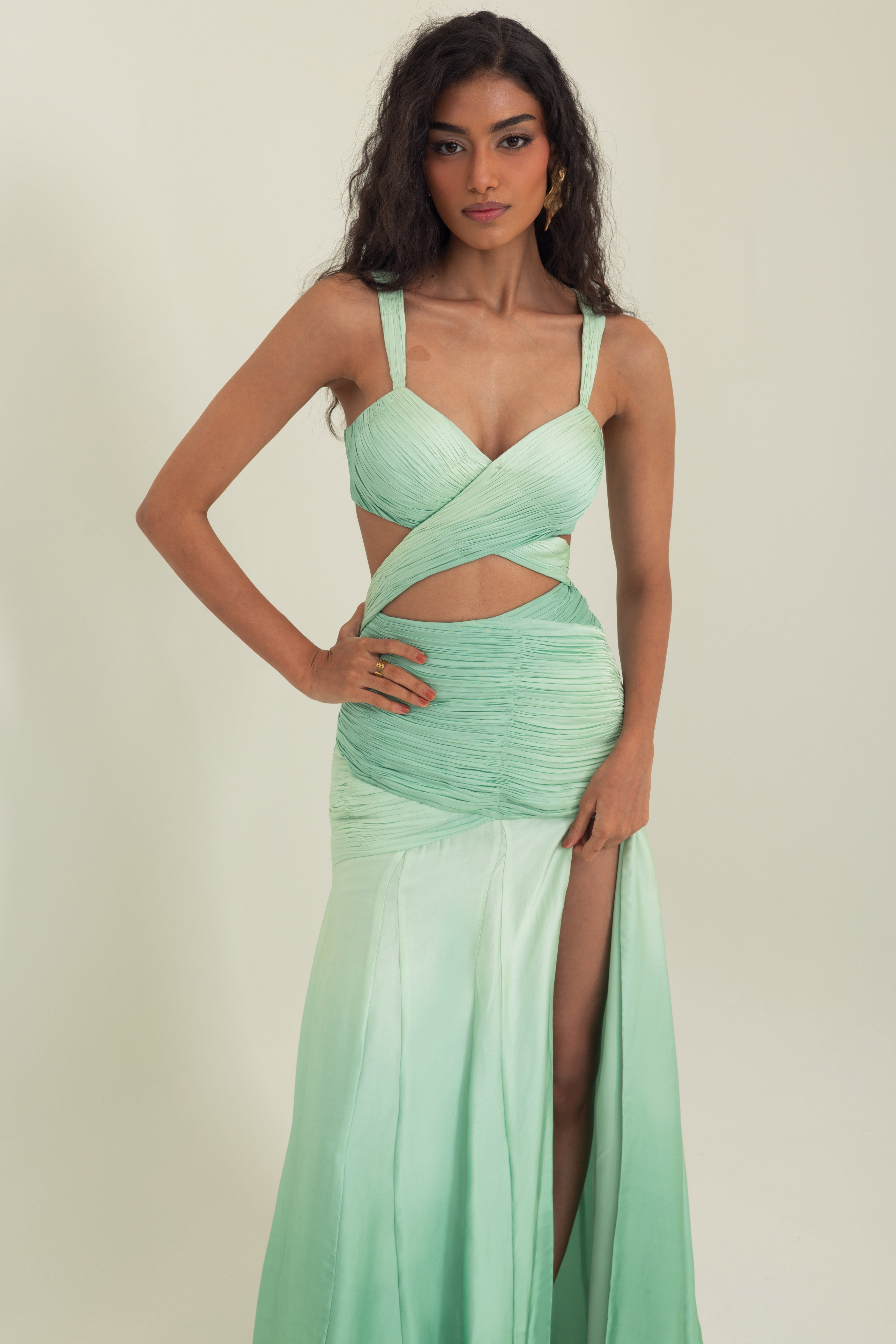 Inspired by the rich hues of Italian olives, this gown is crafted from luxurious satin georgette with a soft, elegant sheen. Hand-ruched detailing wraps around the bodice and waist, creating a flattering fit with a modern cut-out , floor-grazing skirt with a subtle slit, adding a whisper of allure.