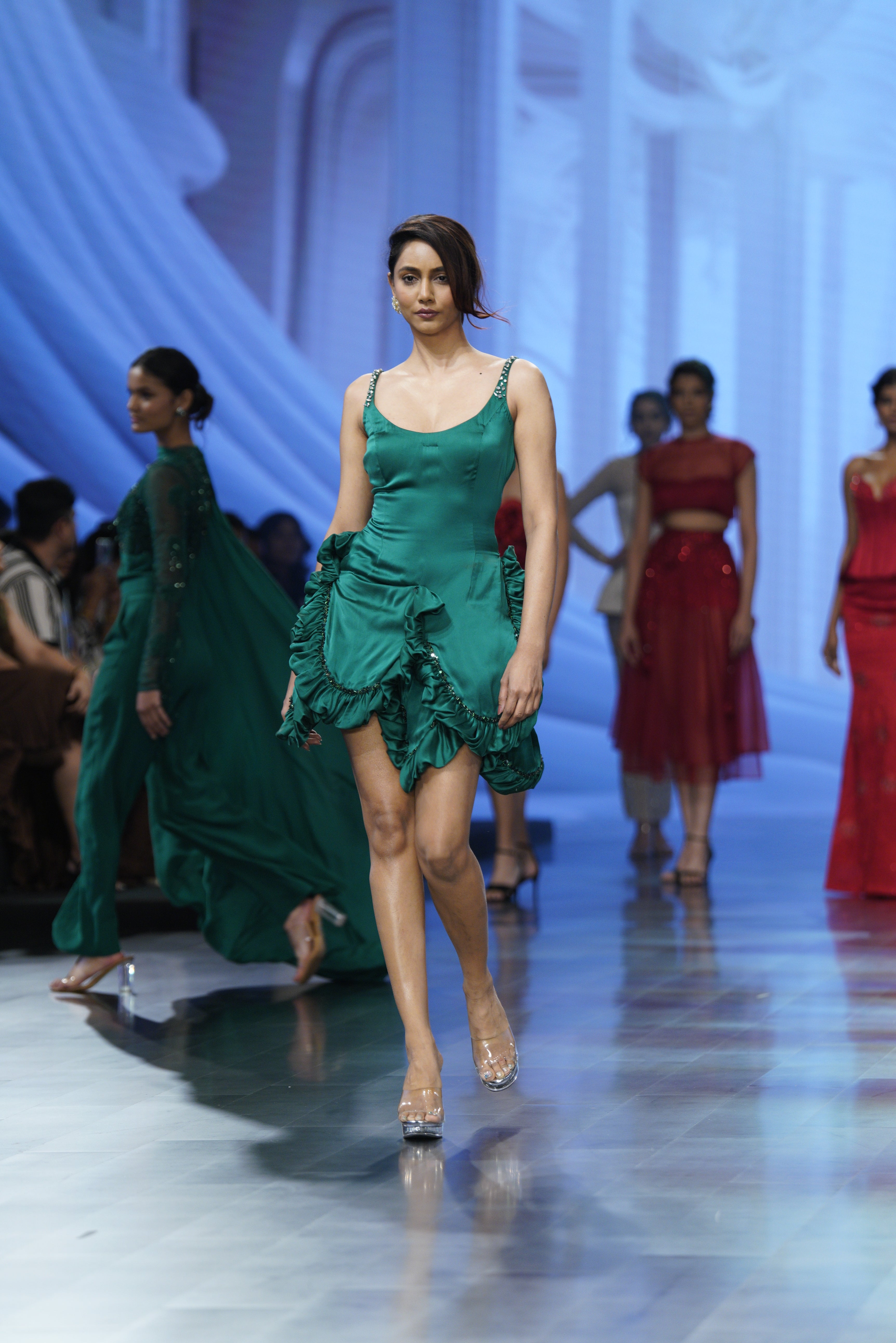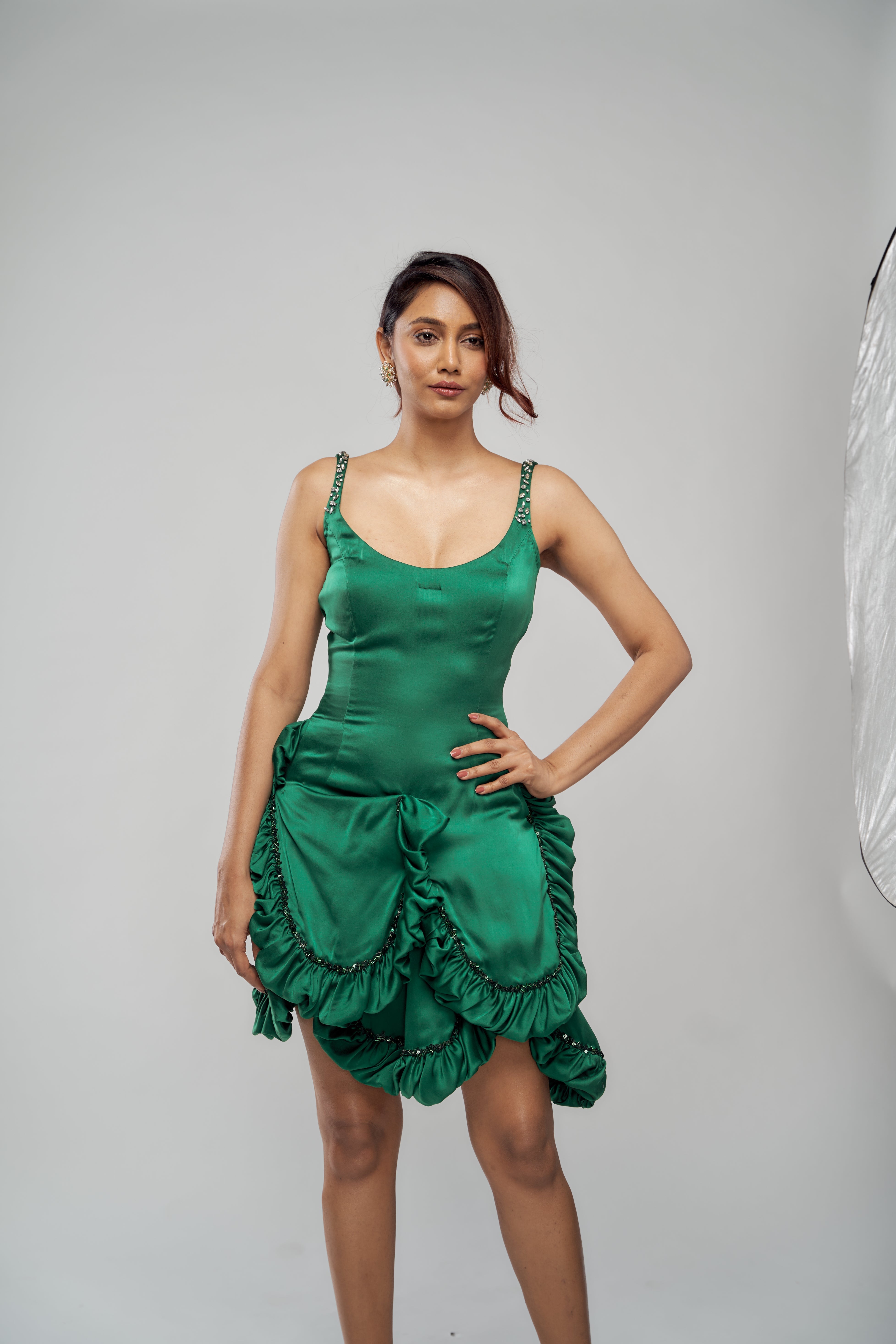 Satin grace meets petal artistry—this twilight-toned dress features delicate embellished straps and sculpted panels that contour like a blooming moment.