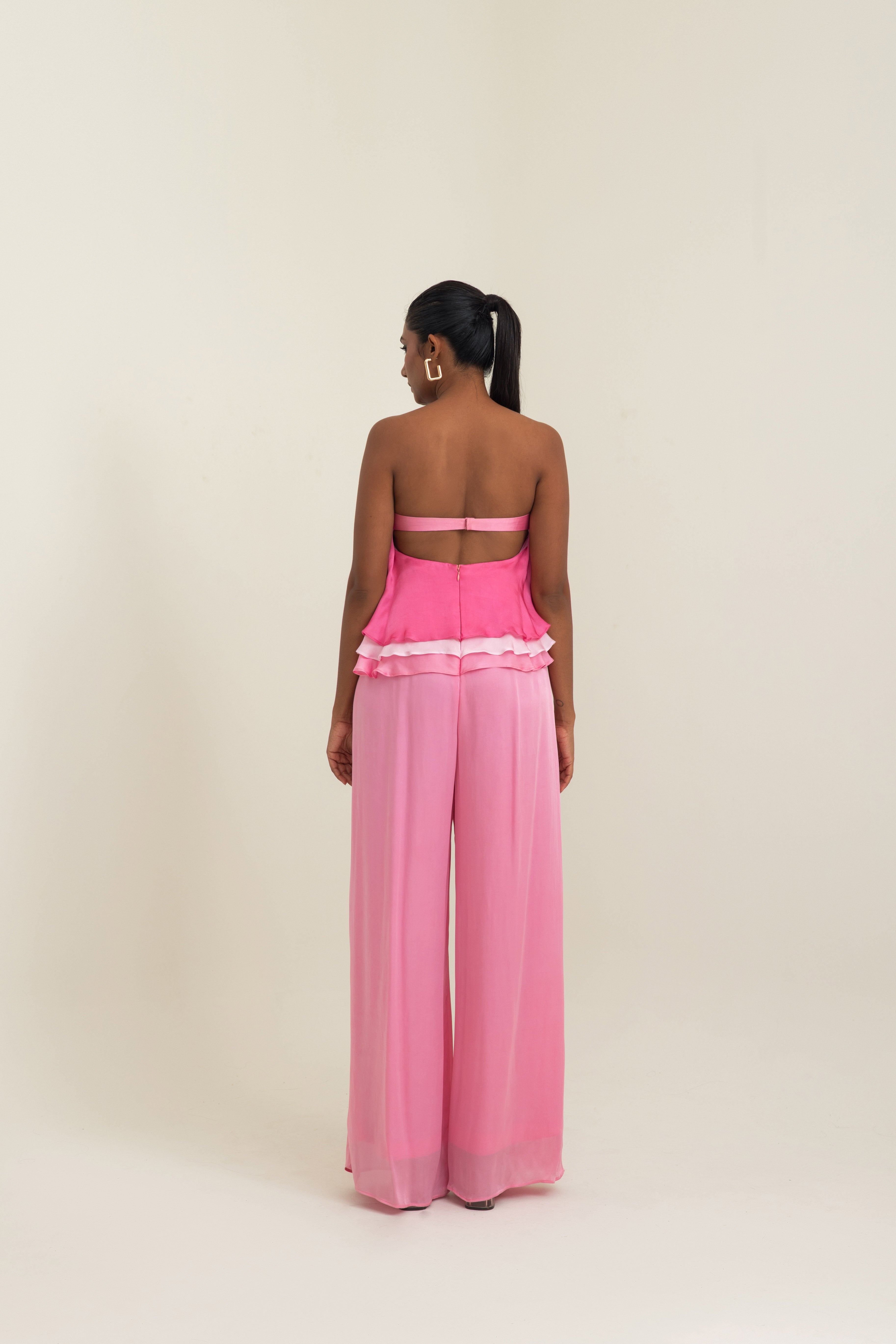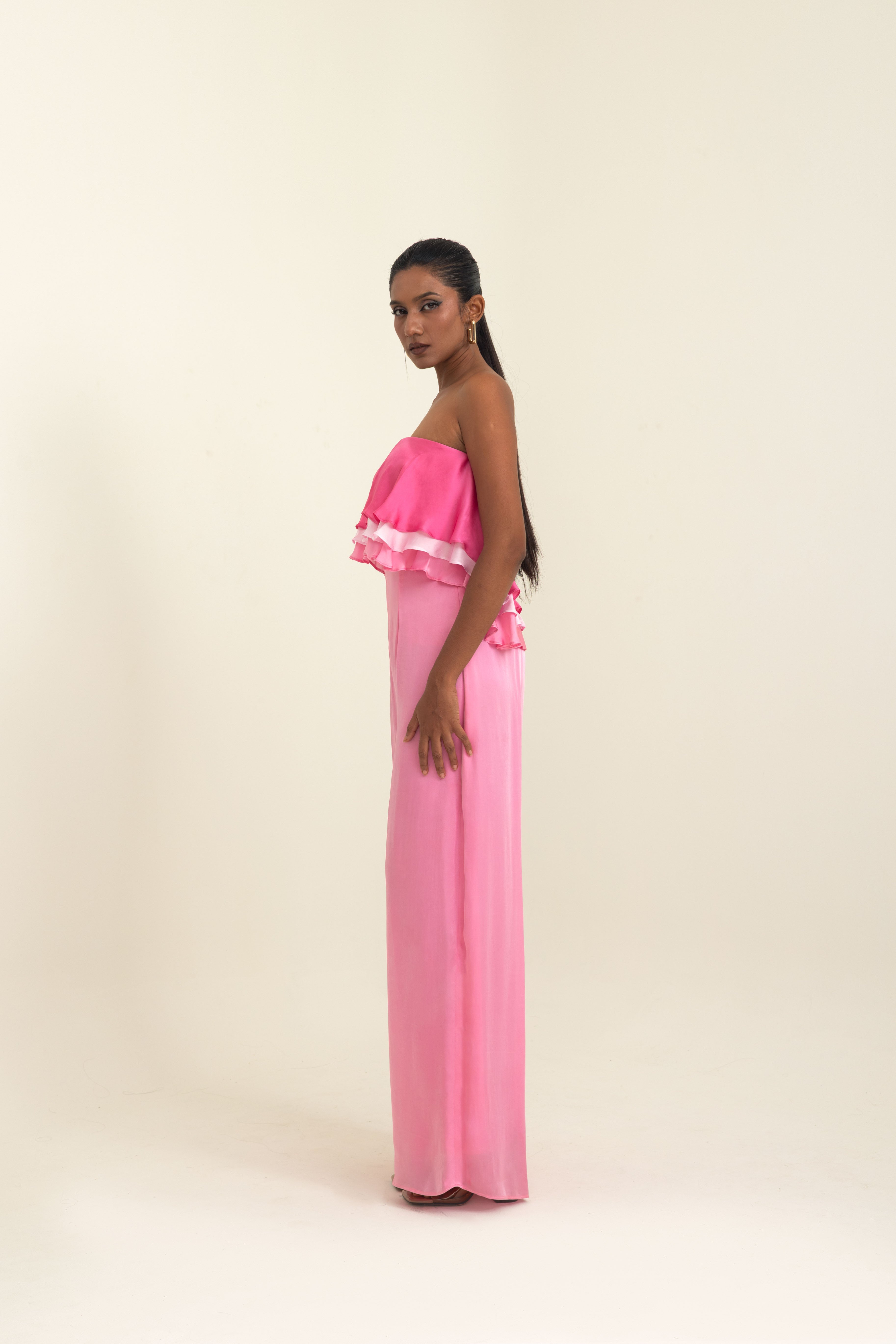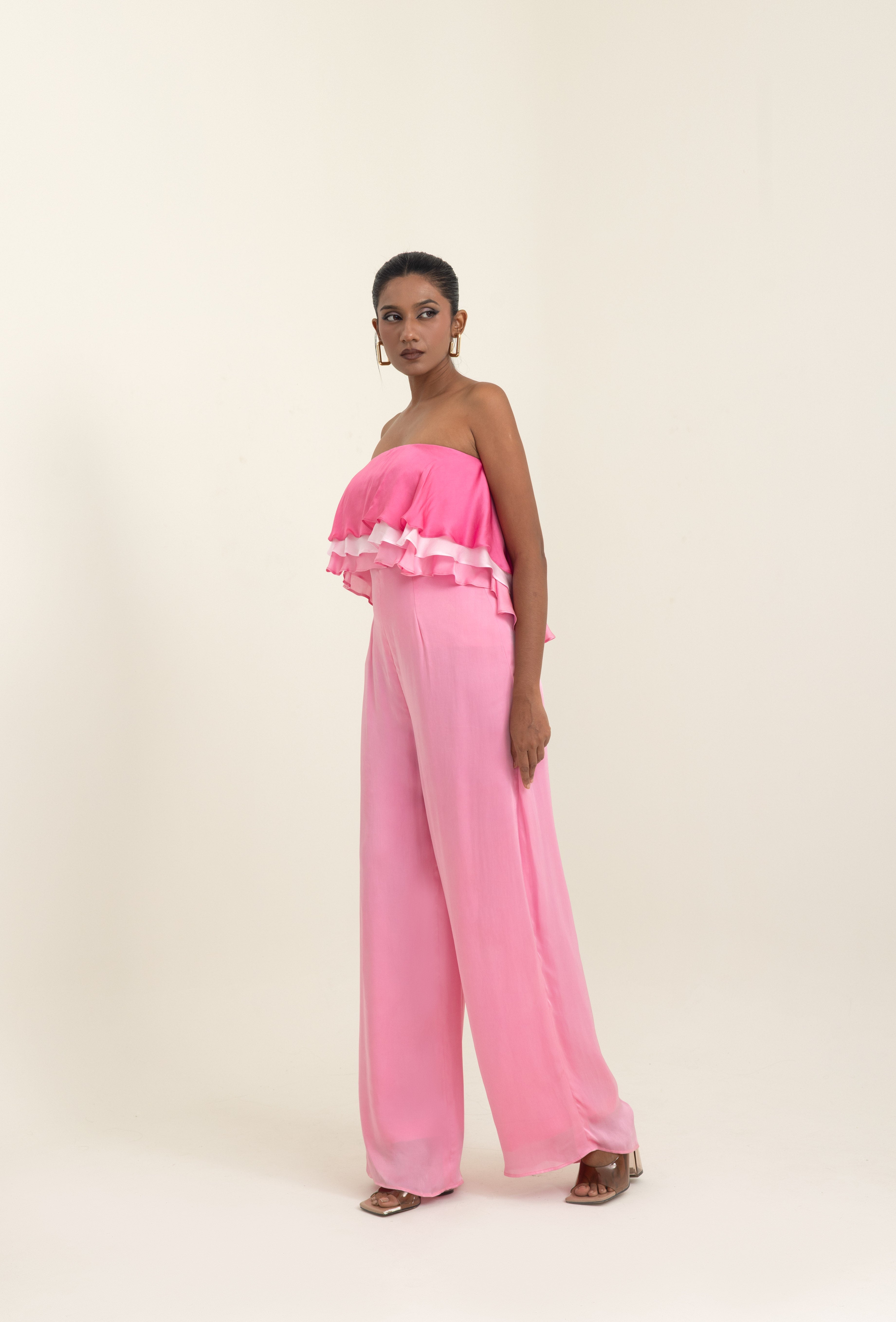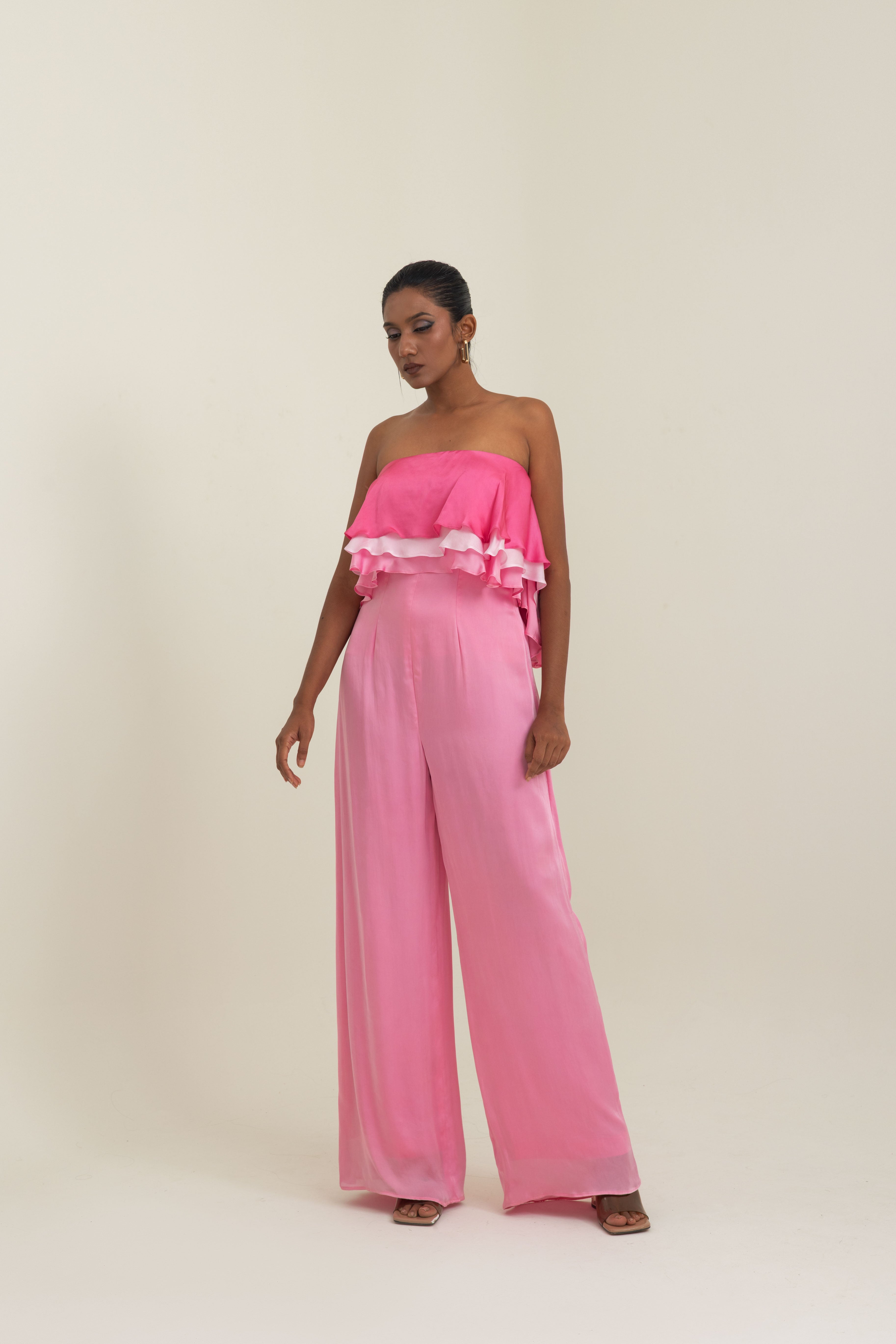 A statement piece that blends elegance with effortless charm, this jumpsuit is crafted in luxurious satin georgette. Designed in shades of pink, it features a playful layered ruffle detail across the bodice, adding movement and femininity to the silhouette. The off-shoulder neckline highlights the collarbones beautifully, while the open-back design lends a modern, sultry edge.