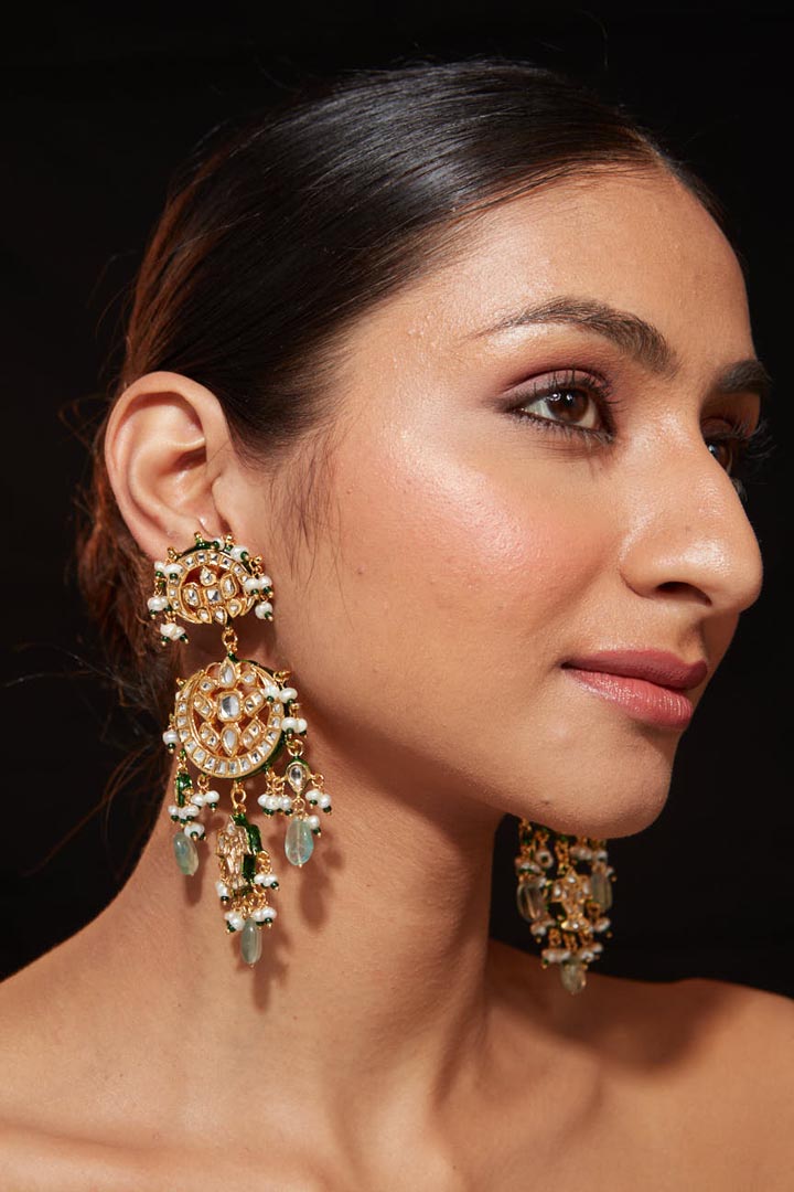 Elegant chandelier-style earrings with intricate detailing and vibrant green accents. Perfect for festive occasions, these statement earrings exude luxury and charm, enhancing any outfit with a regal touch.