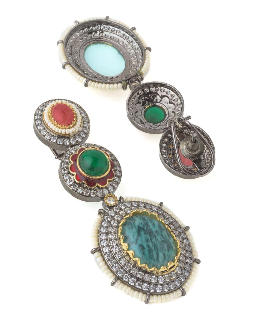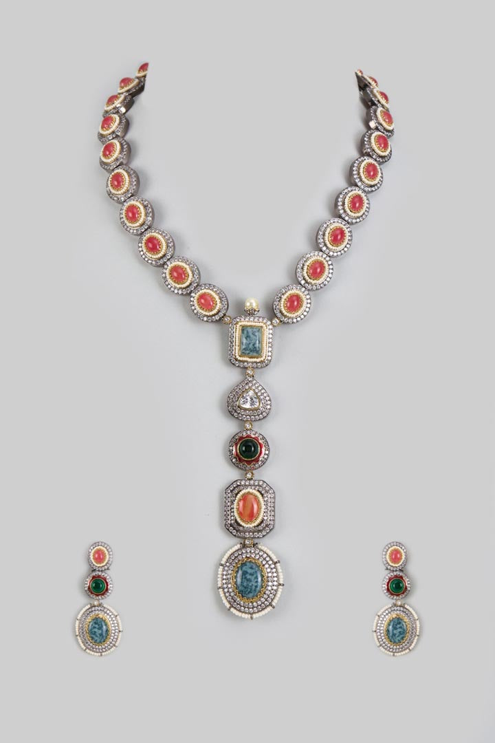 This handcrafted necklace set features a traditional blend of red, green, and blue textured stones, beautifully accented with American diamonds. Ideal for festive and ethnic wear, it exudes royal elegance.