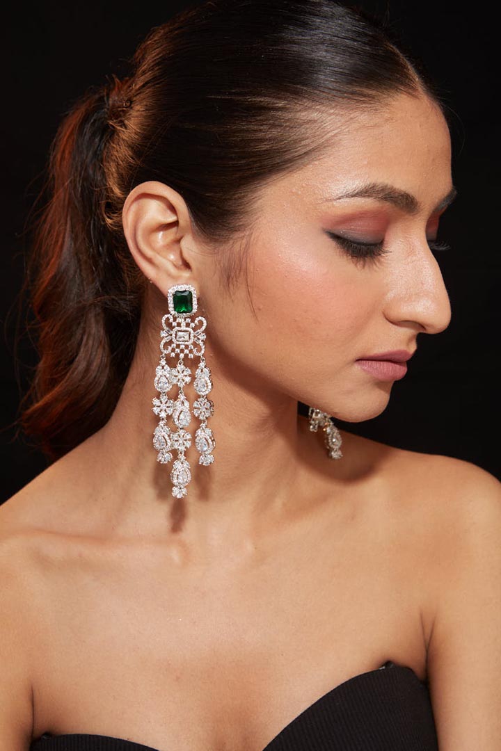 Elevate your elegance with these stunning statement earrings. Adorned with emerald green stones and cascading crystals, they exude timeless sophistication, perfect for special occasions or formal events.