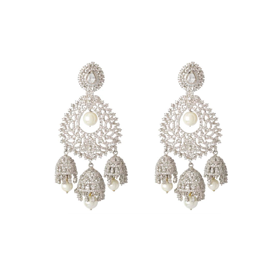 Exquisite statement earrings with an intricate silver-tone design and pearl accents. Perfectly crafted to enhance your elegance, these earrings are ideal for weddings, festive occasions, and grand celebrations.