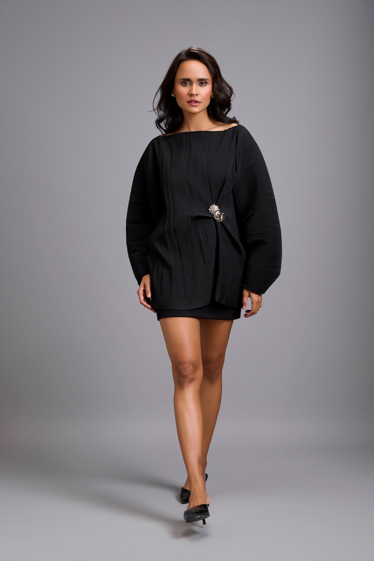 Voluminous Black Pleated Top With Oversized Sleeves with Cinched Waist Detail