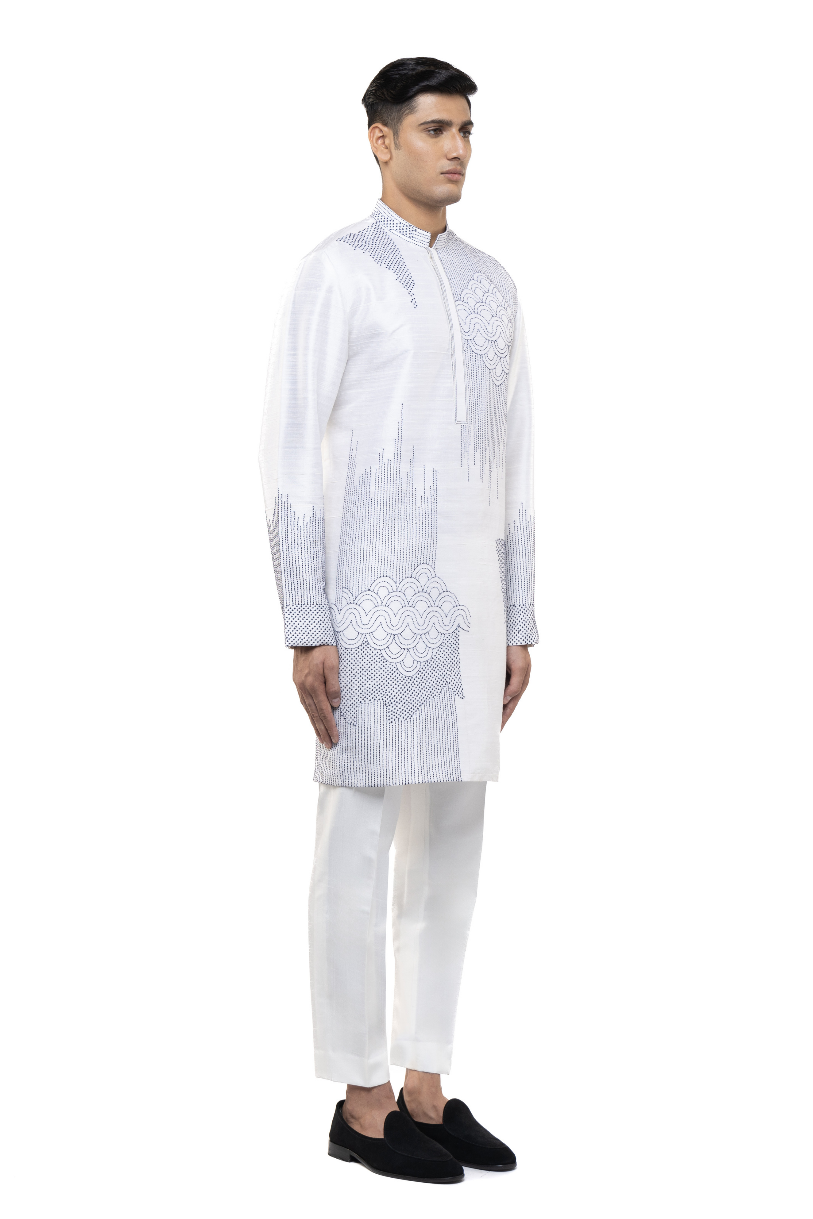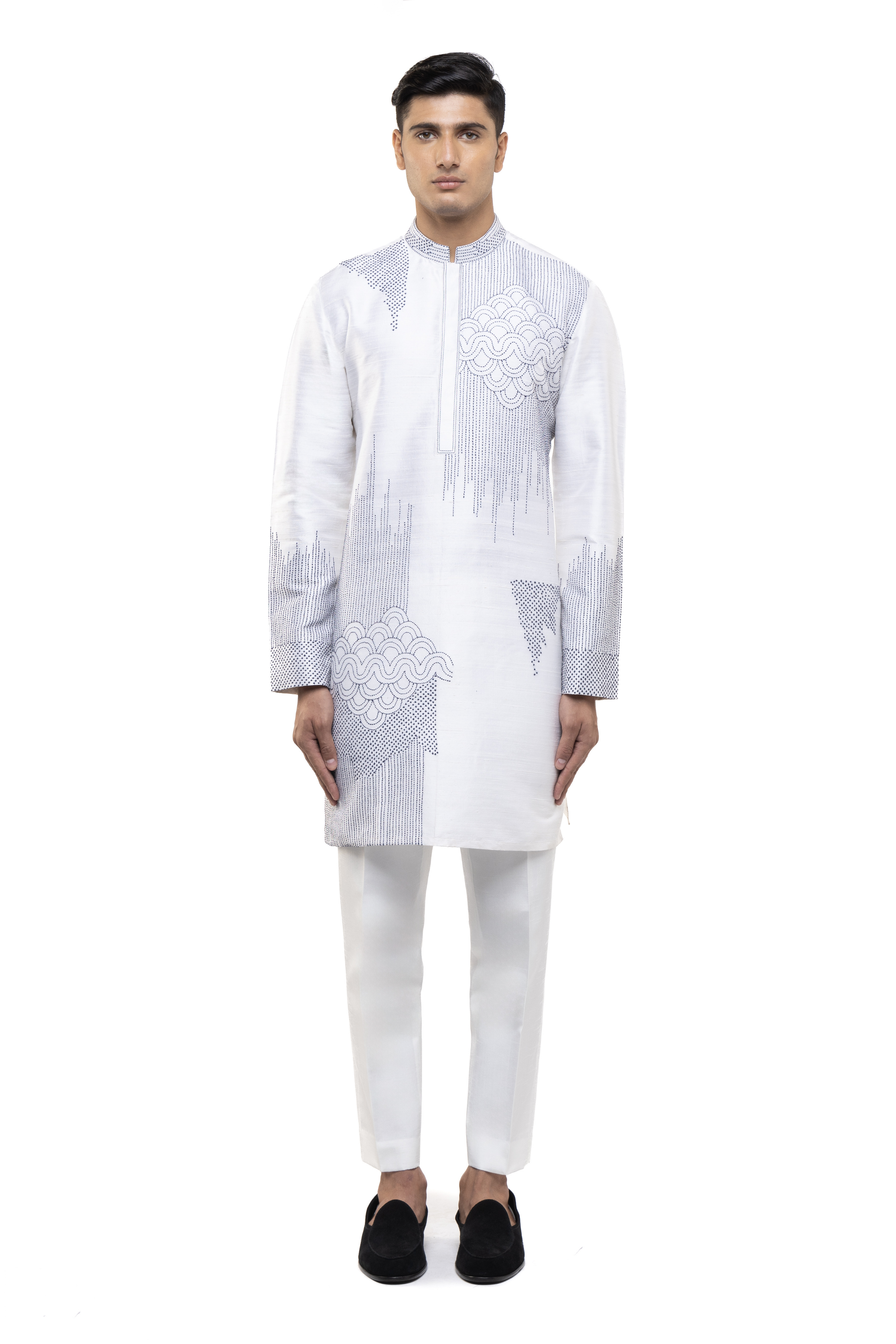 A white and blue silk kurta set with thread embroidery, offering a fresh and modern take on traditional ethnic and festive attire.