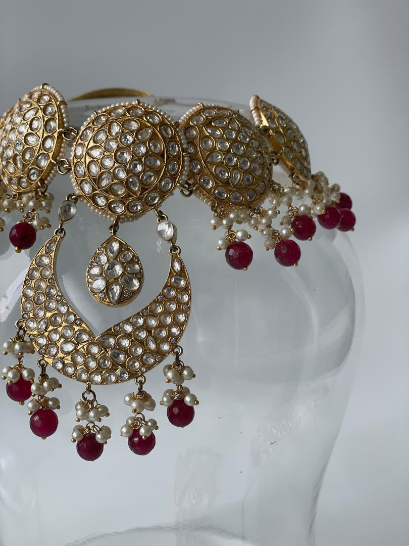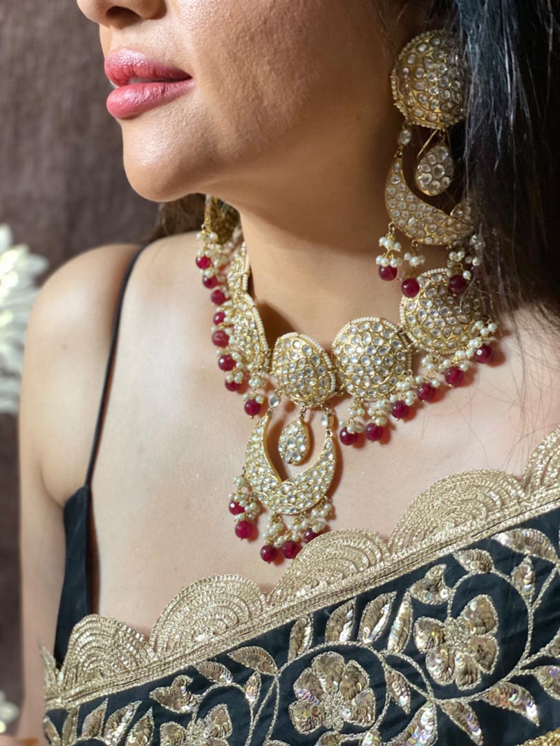 White Kundan Choker Set With Red Beads , Necklace L:4, W: 7.5