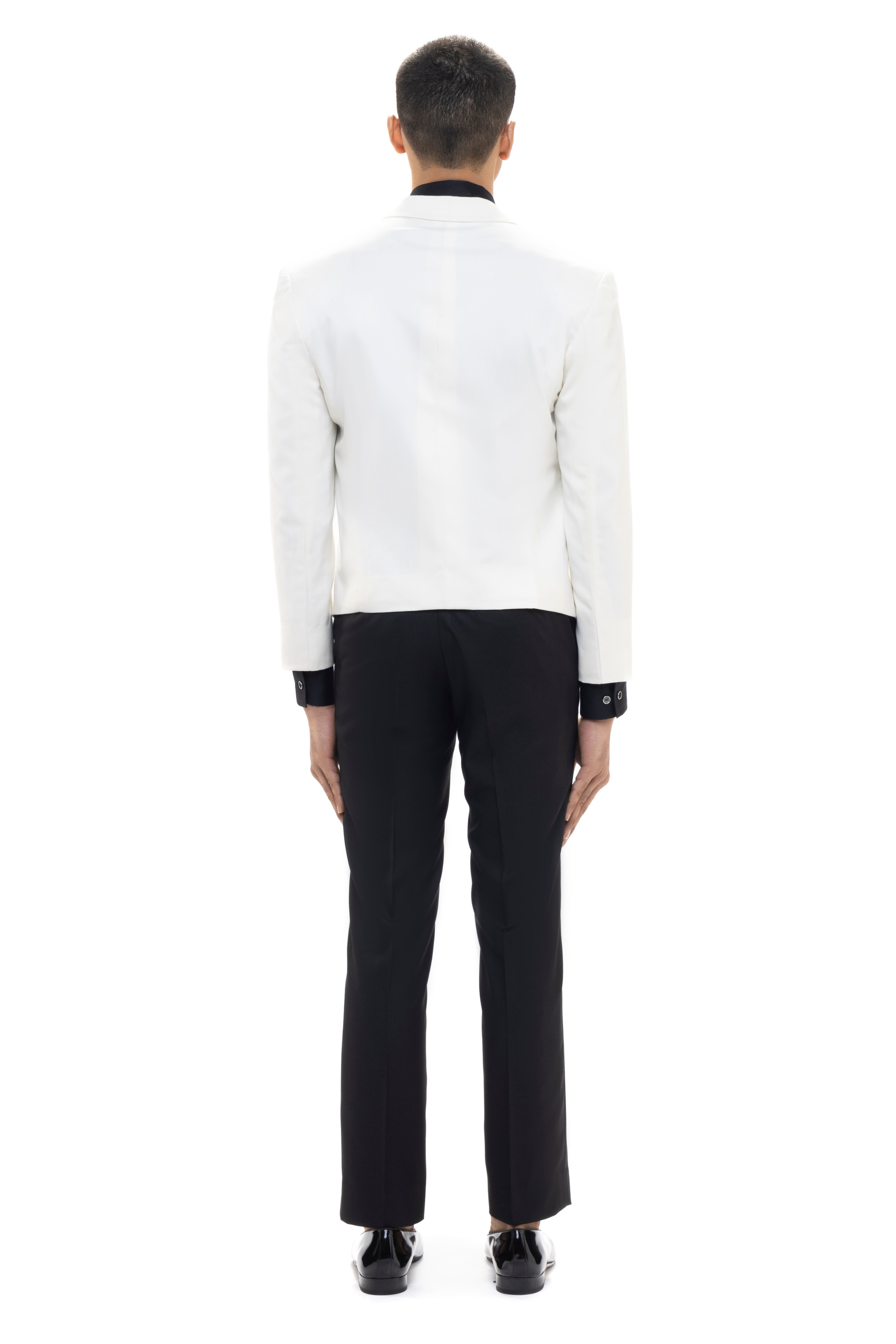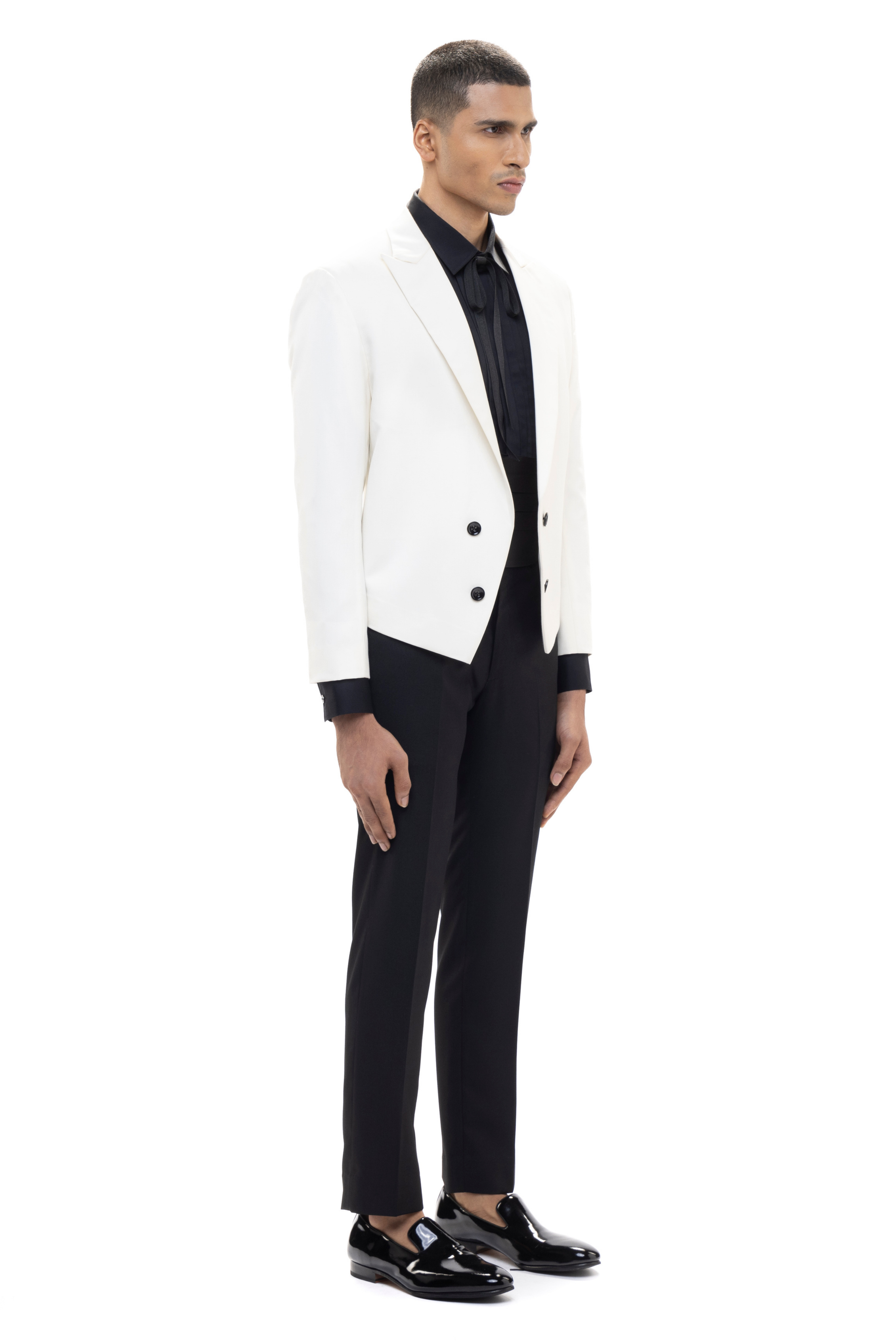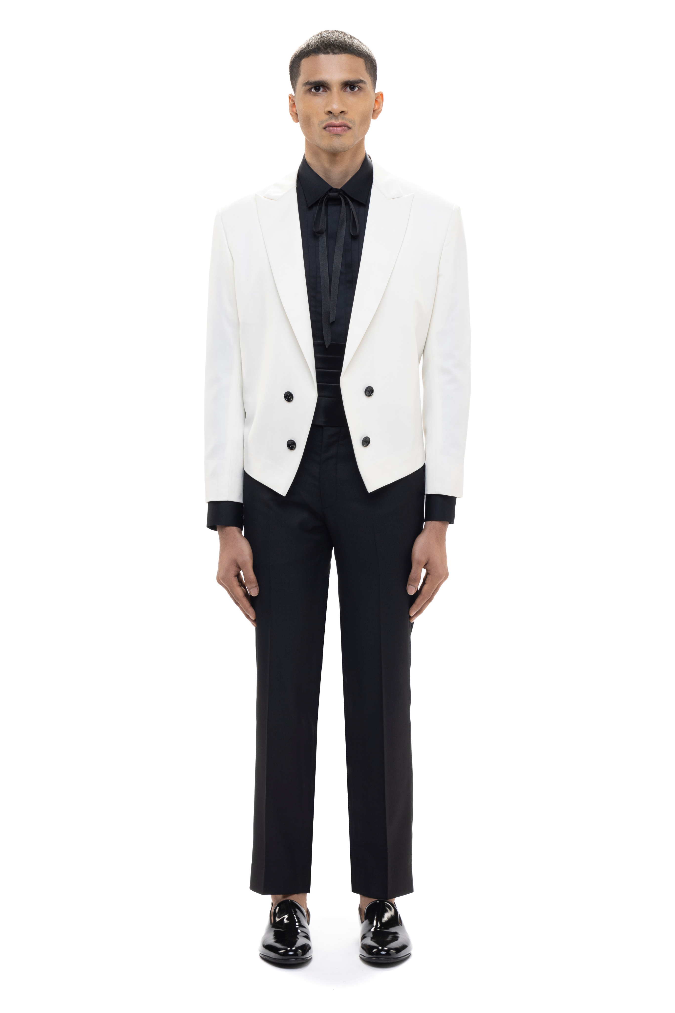 This white worsted wool peak lapel cropped tuxedo set is an elegant choice for receptions, sangeet, or cocktail events.