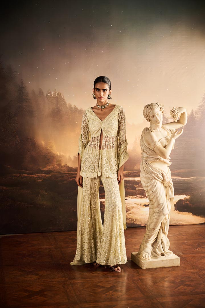 This peplum and sharara is braided with thread work and handsewn with sequins and cutdana. This hue is a pure elegance in itself. It is paired with four sided mirror embroidered dupatta