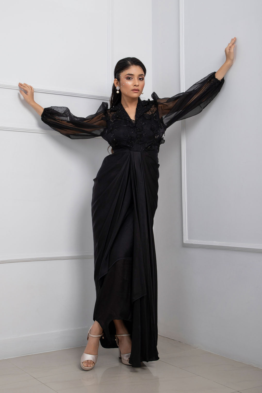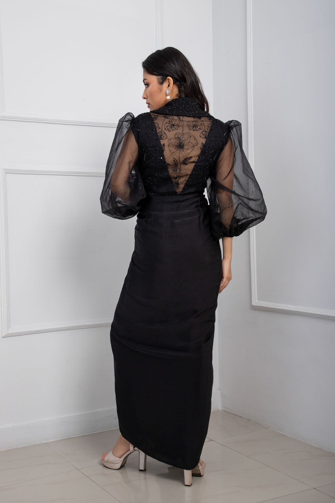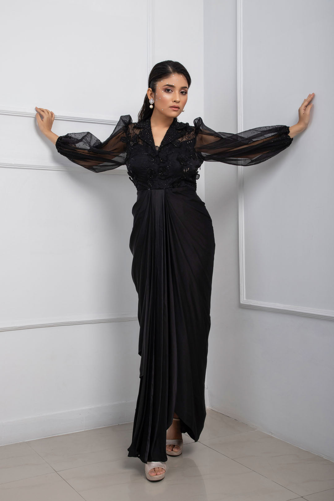 Command the spotlight in this exquisite black gown, accentuated with a chic net collar and intricate sequence detailling embodying elegance and allure.