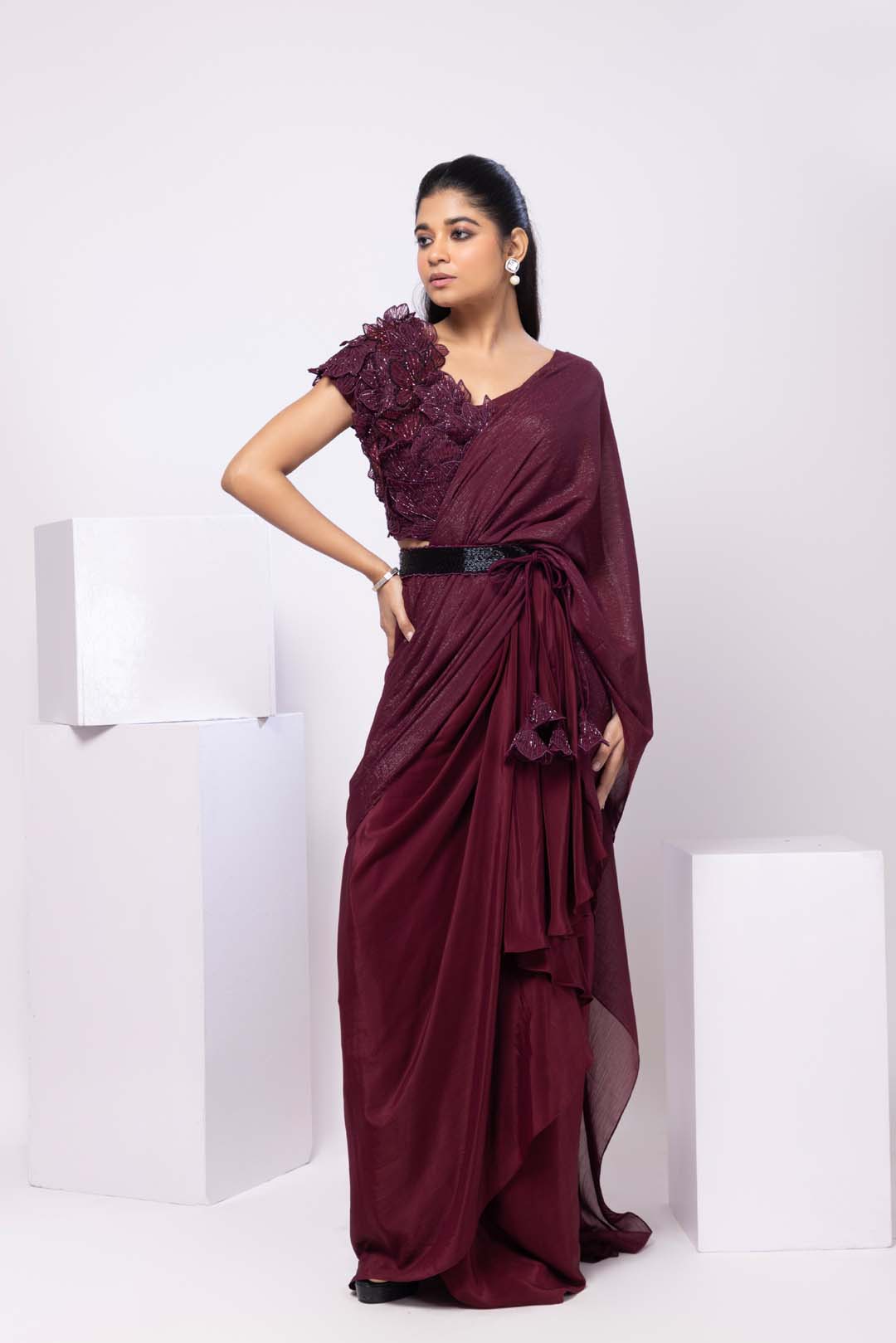 Elevate your partywear collection with this indowestern wine drape saree. It features a shimmering palla attached to the beautifully crafted drape skirt that adds a modern twist to the outfit. Intricately designed 3D flower blouse with wine and black embroidery adds texture to the outfit. The embellished belt with feathered flower tassels cinches the waist for a flattering silhouette.