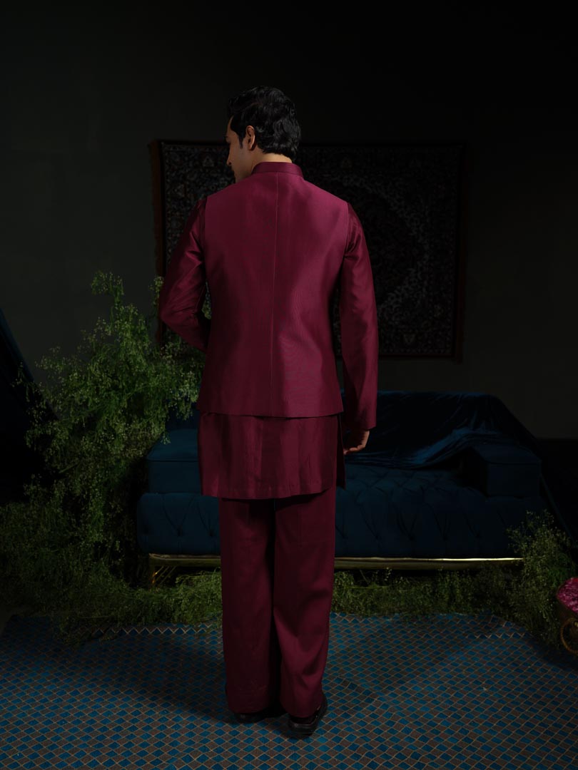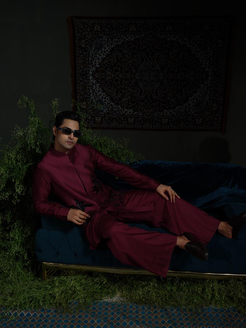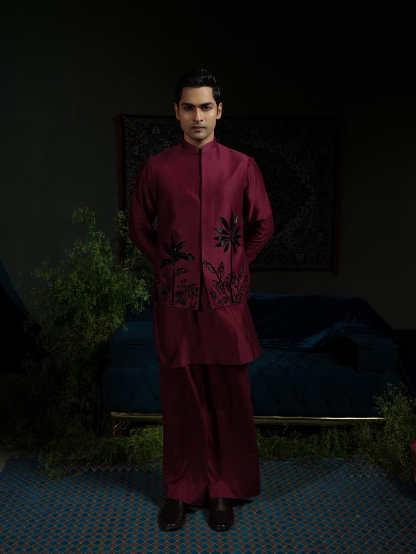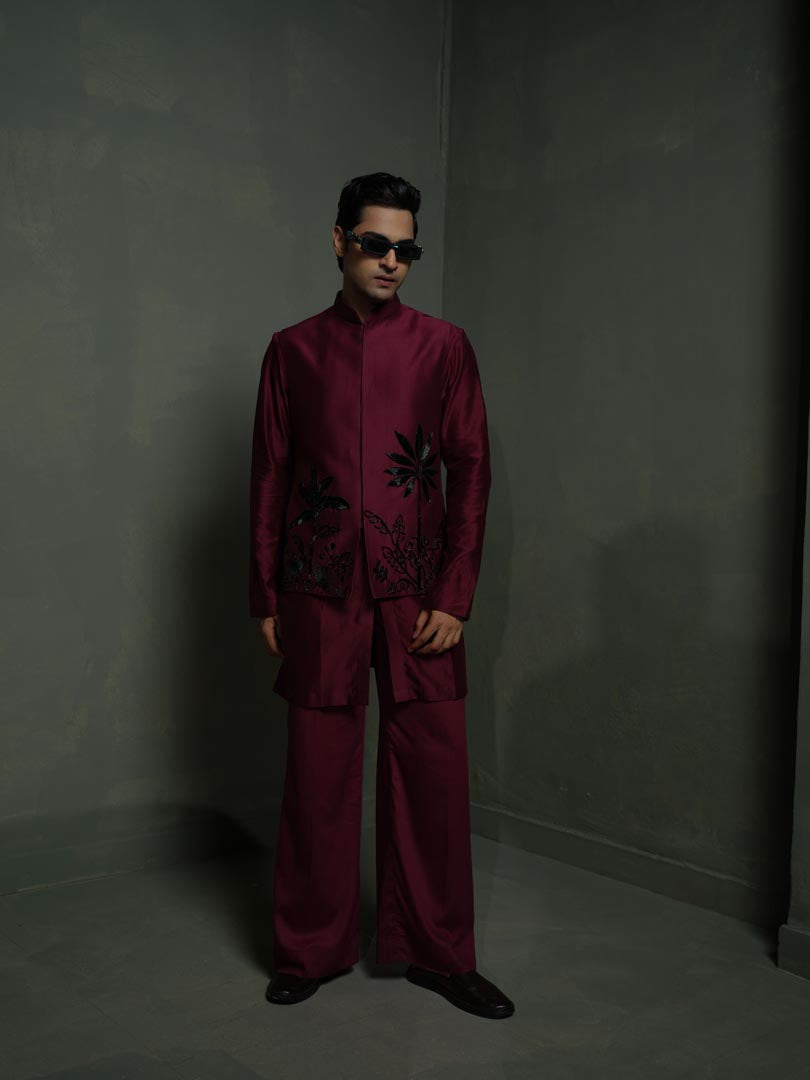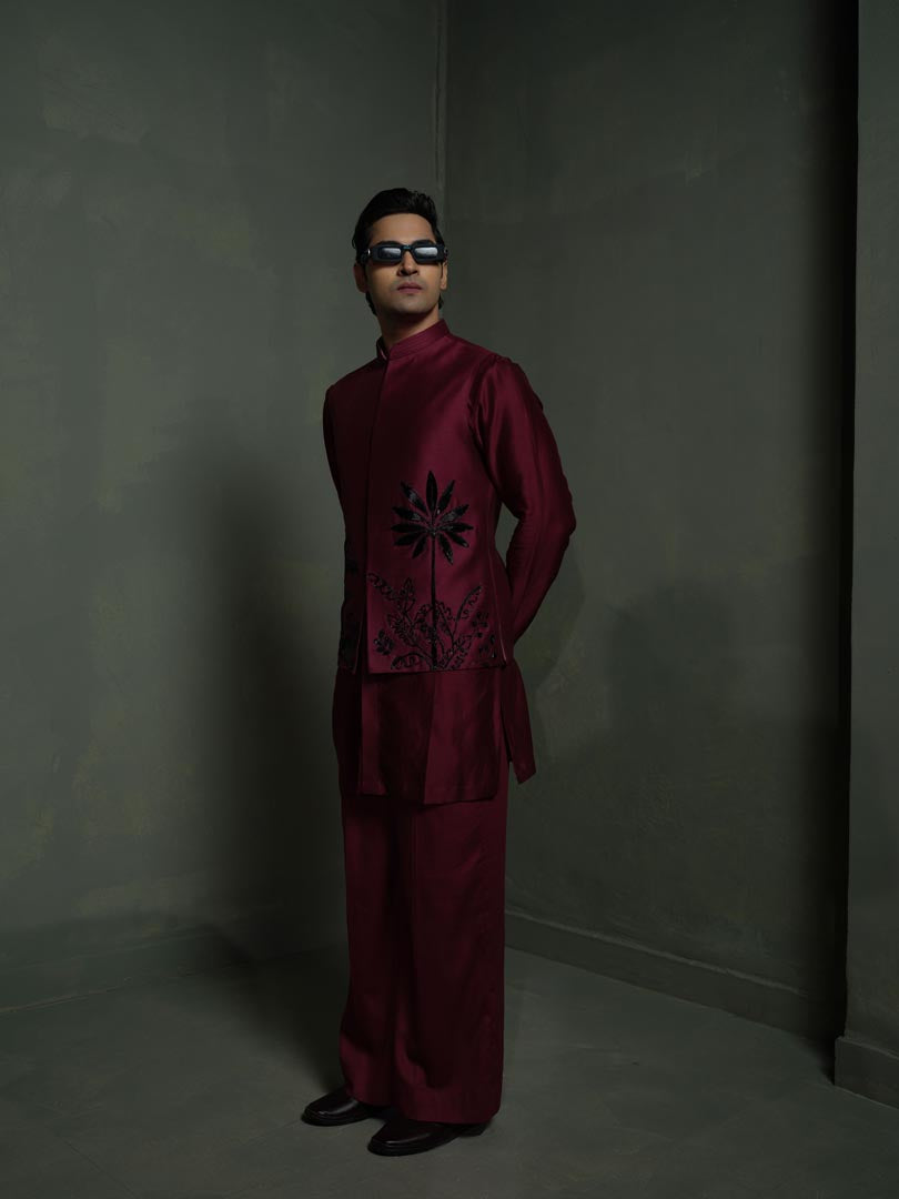 The bundi embraces the modernity in classic silhouette. Dyed in Wine hue, the modern motifs of greenary make a statement in any occassion.