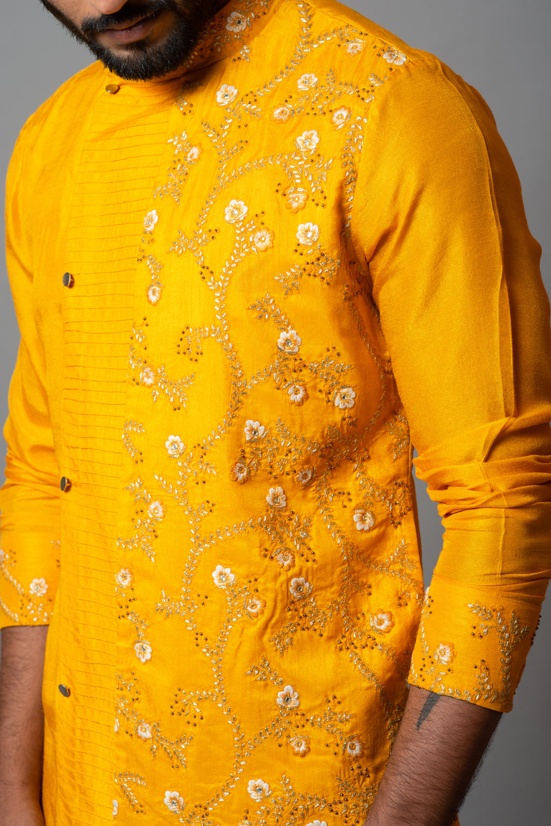 Yellow panelled kurta with pin tucks and embroidery panels, paired with pant pajama. Kurta length is 43"(short) and 46"(long).**The color may slightly vary due to screen lighting.