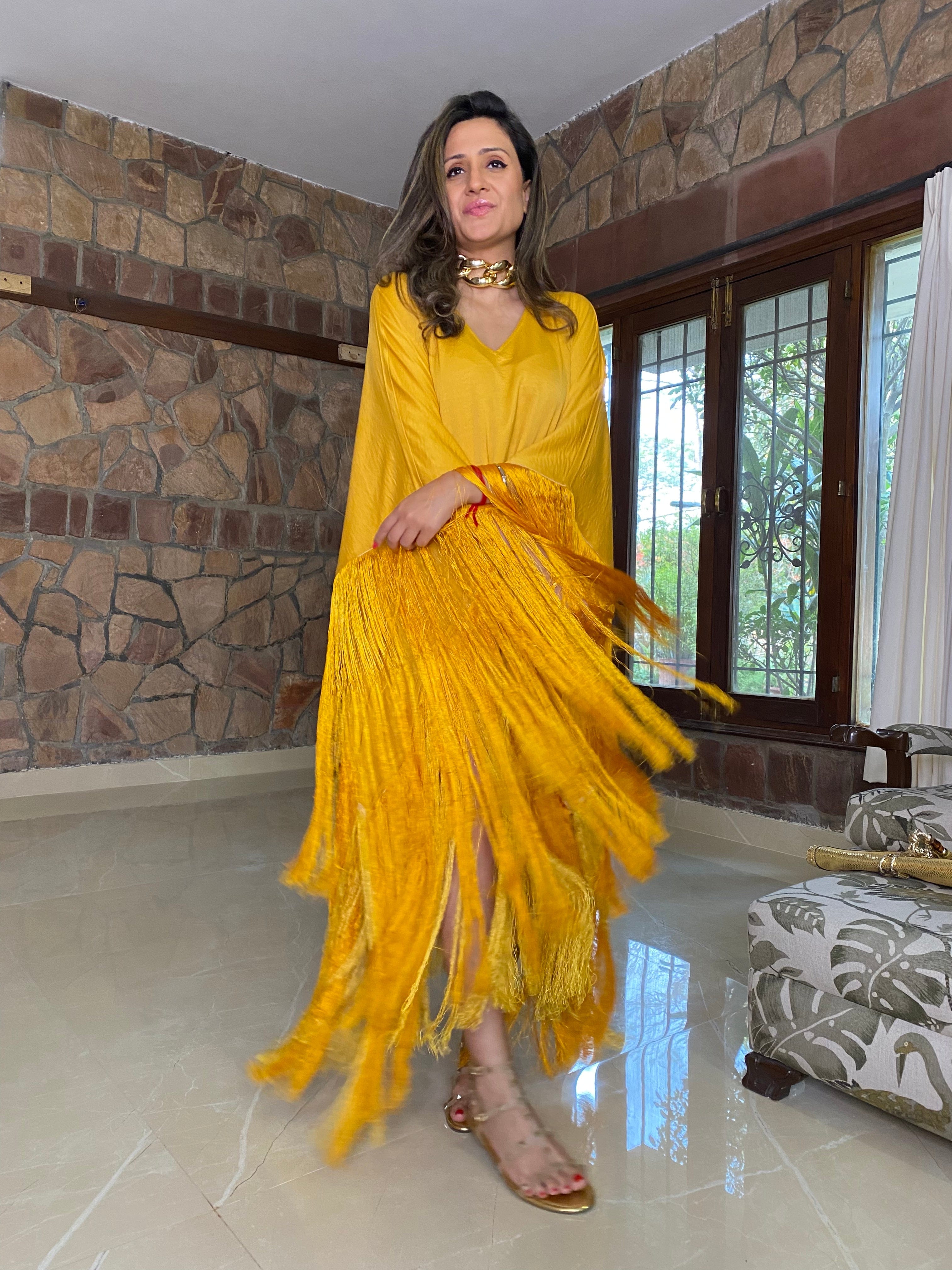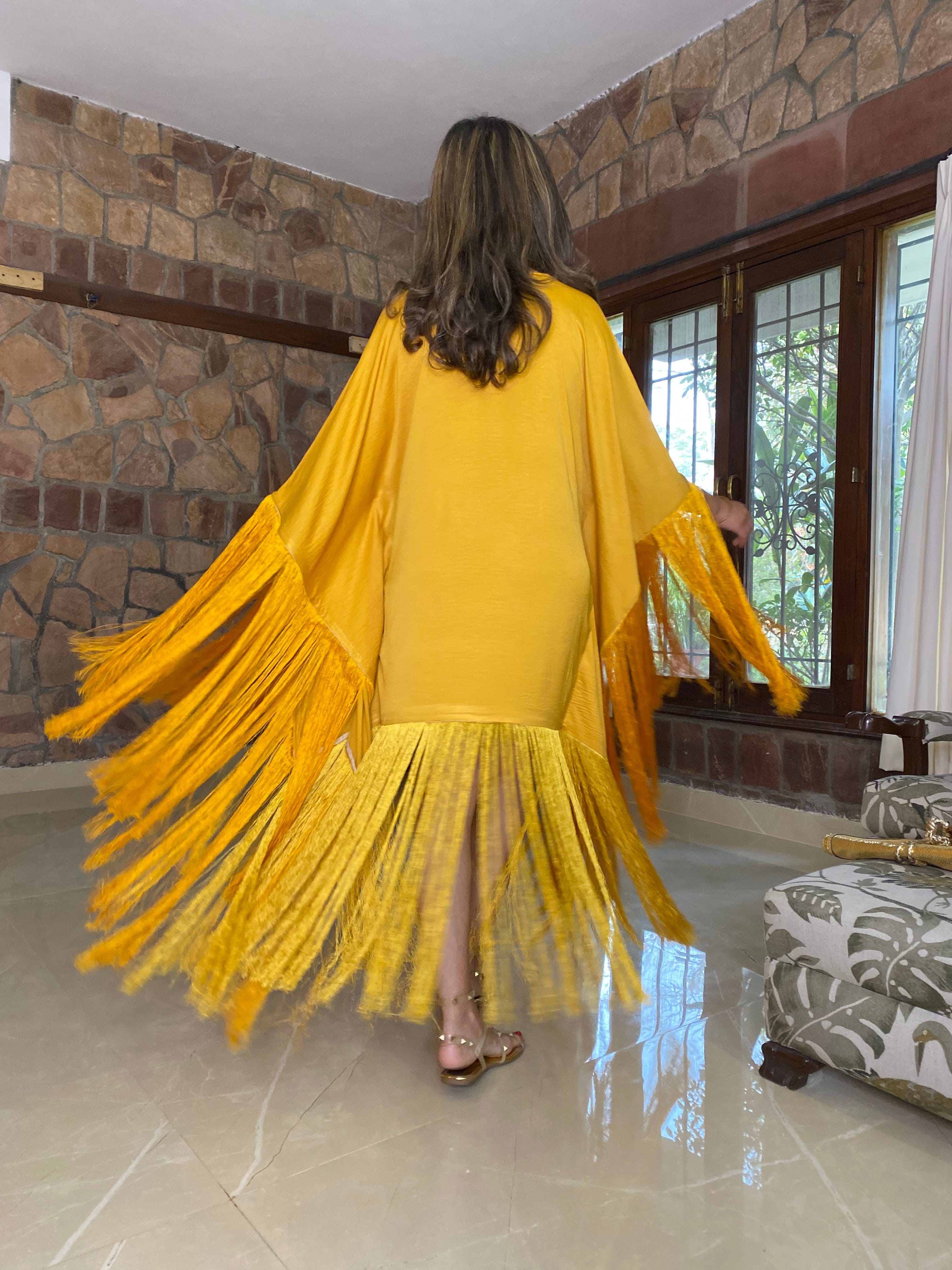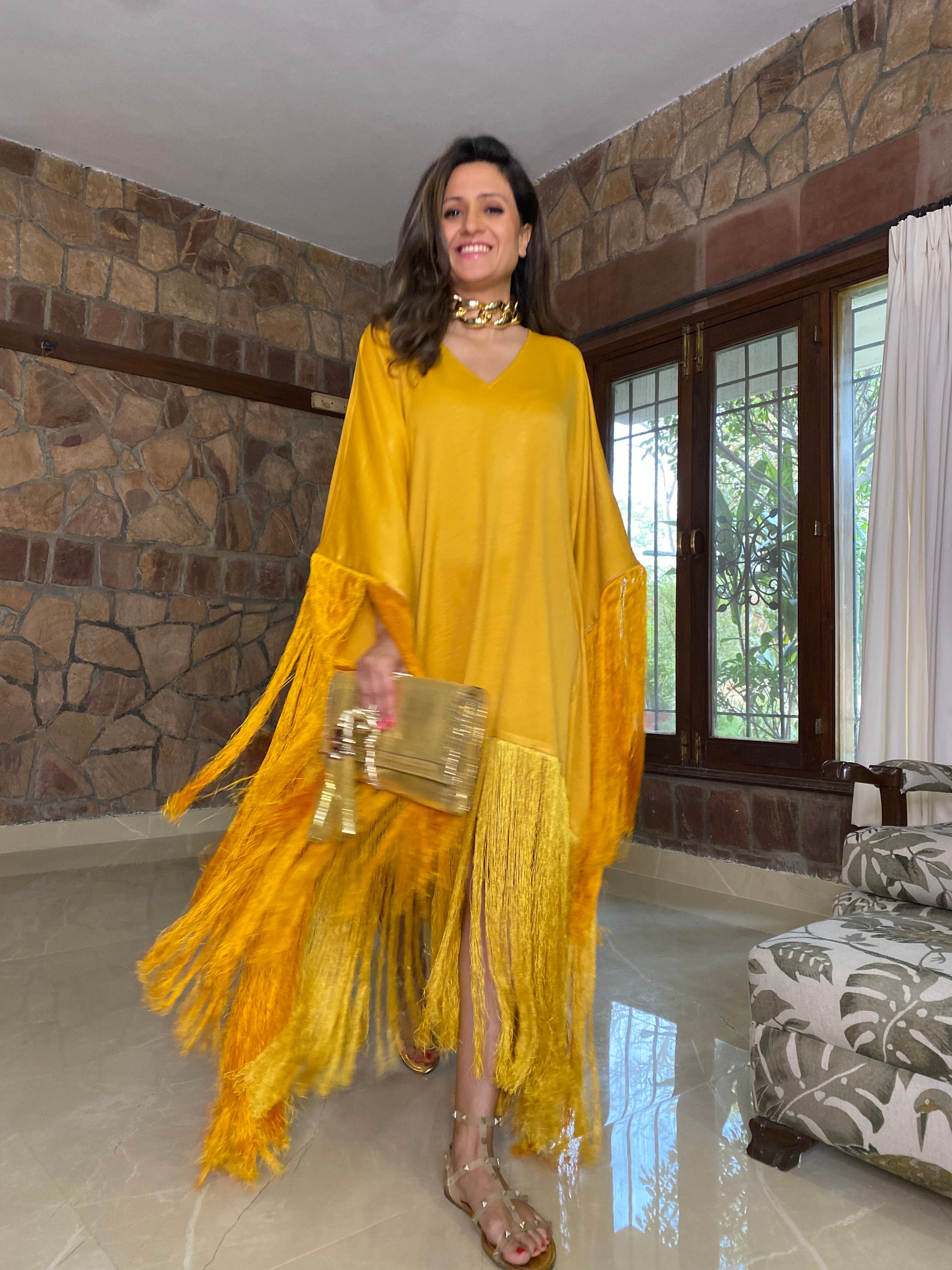 Kaftan has a v-neck with Frill on the sleeves and the hem of the dress.