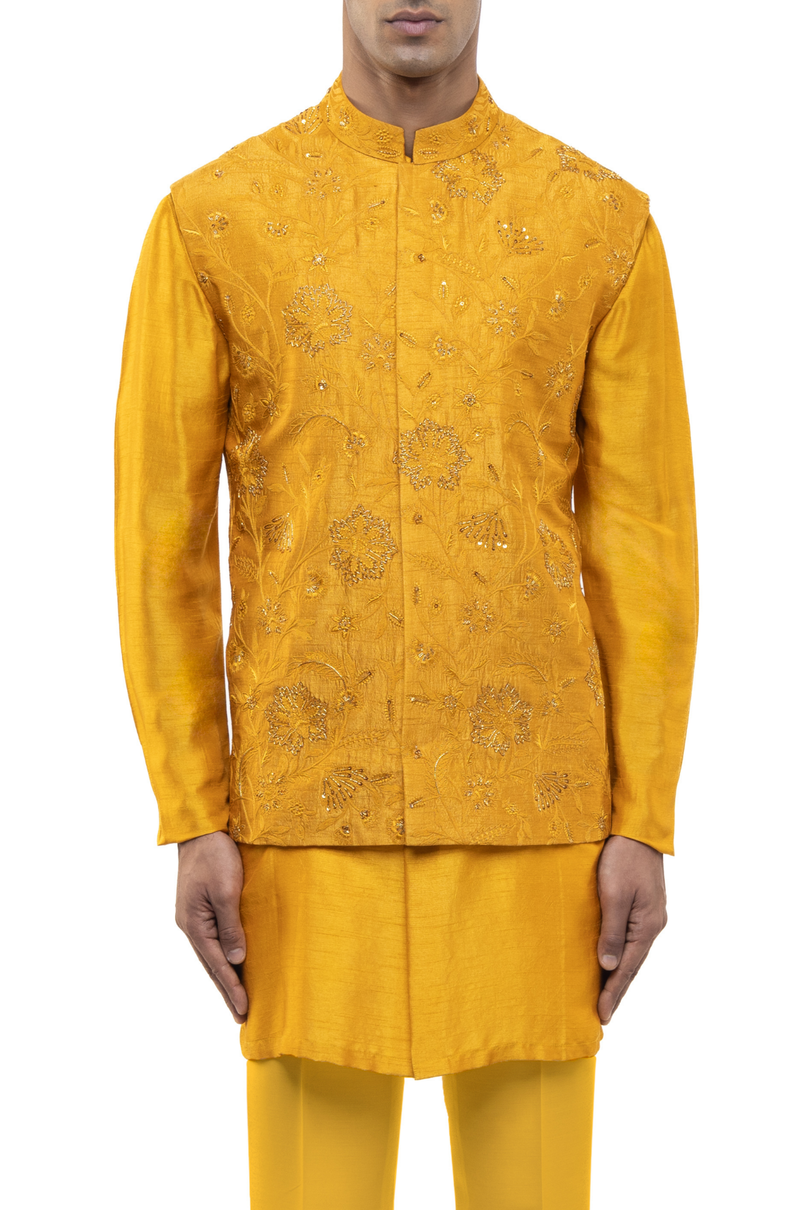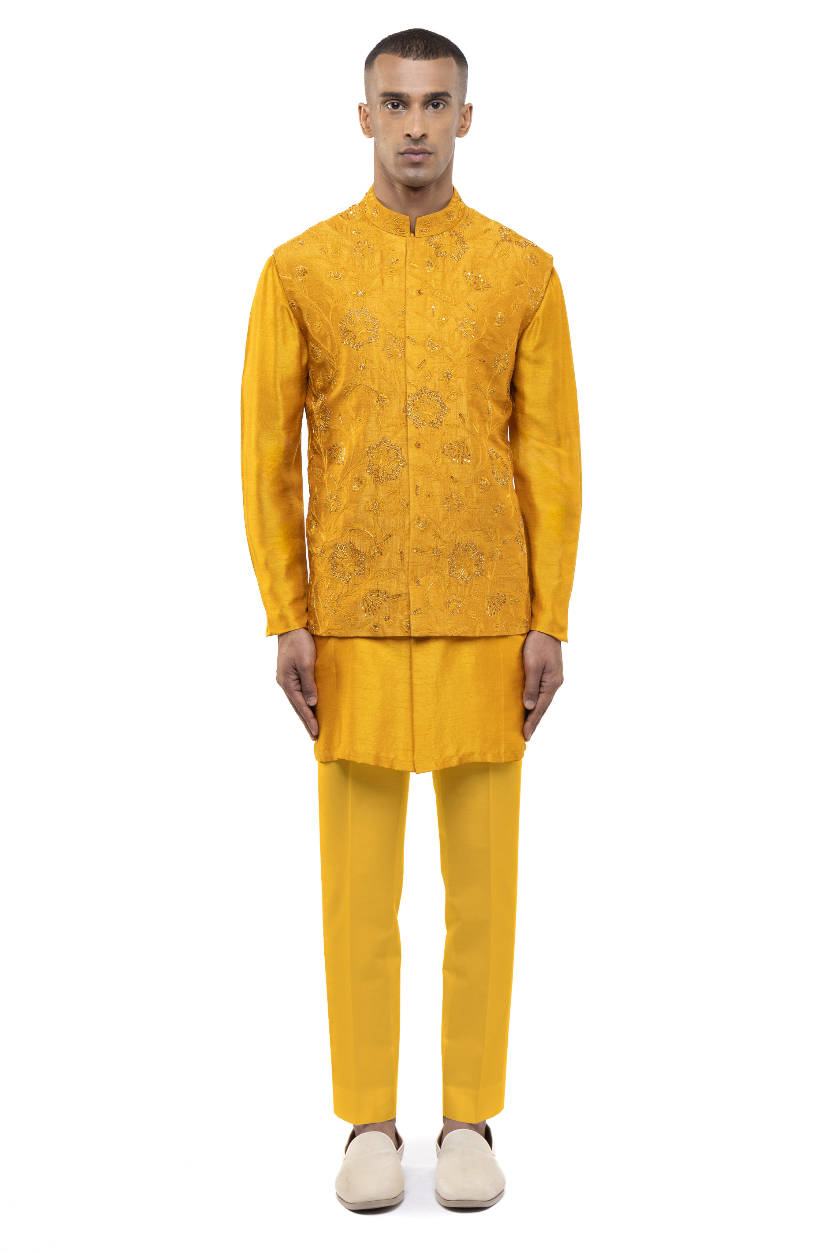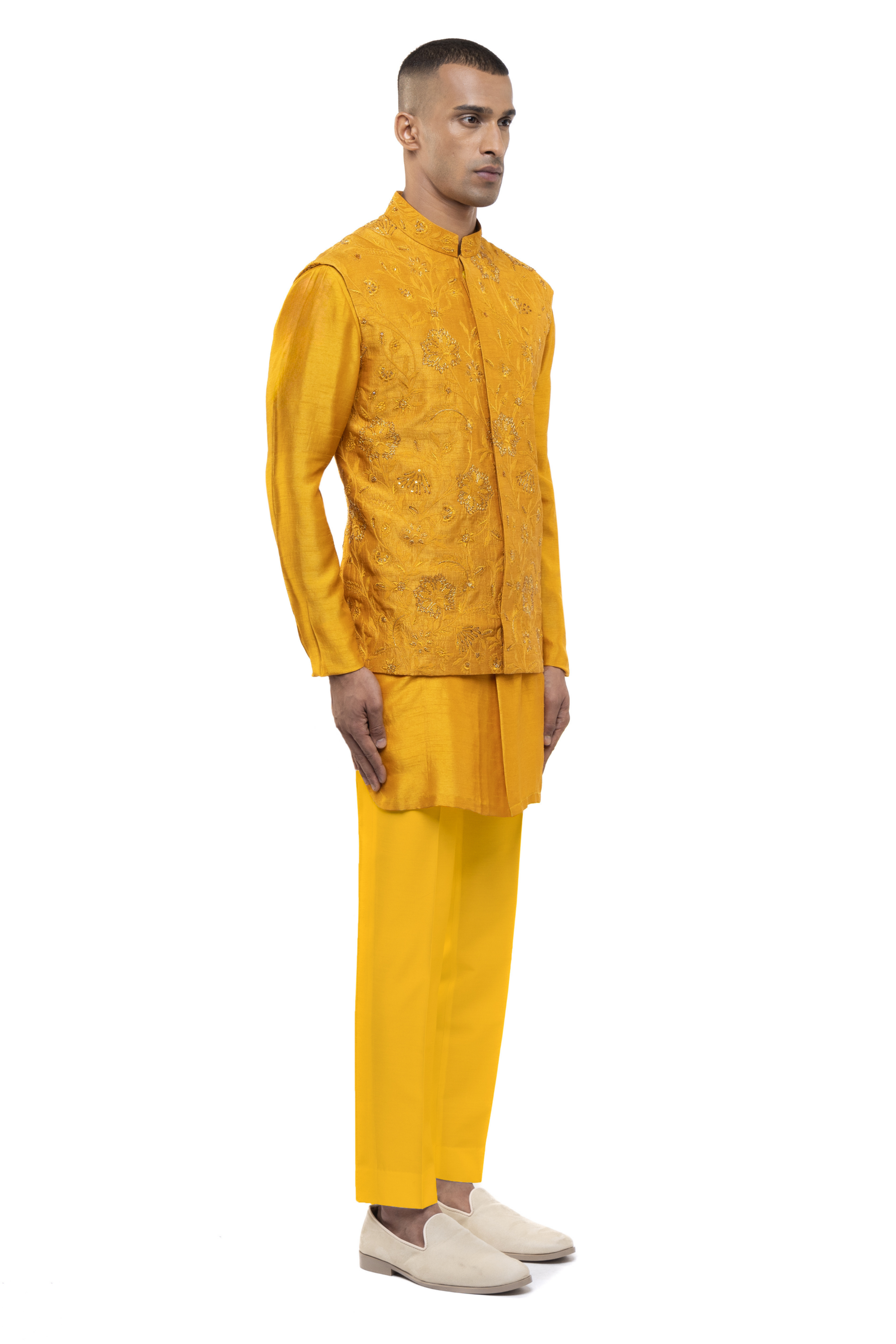 This yellow georgette kurta bandi set, adorned with floral embroidery, is perfect for haldi, ethnic, and festive events.