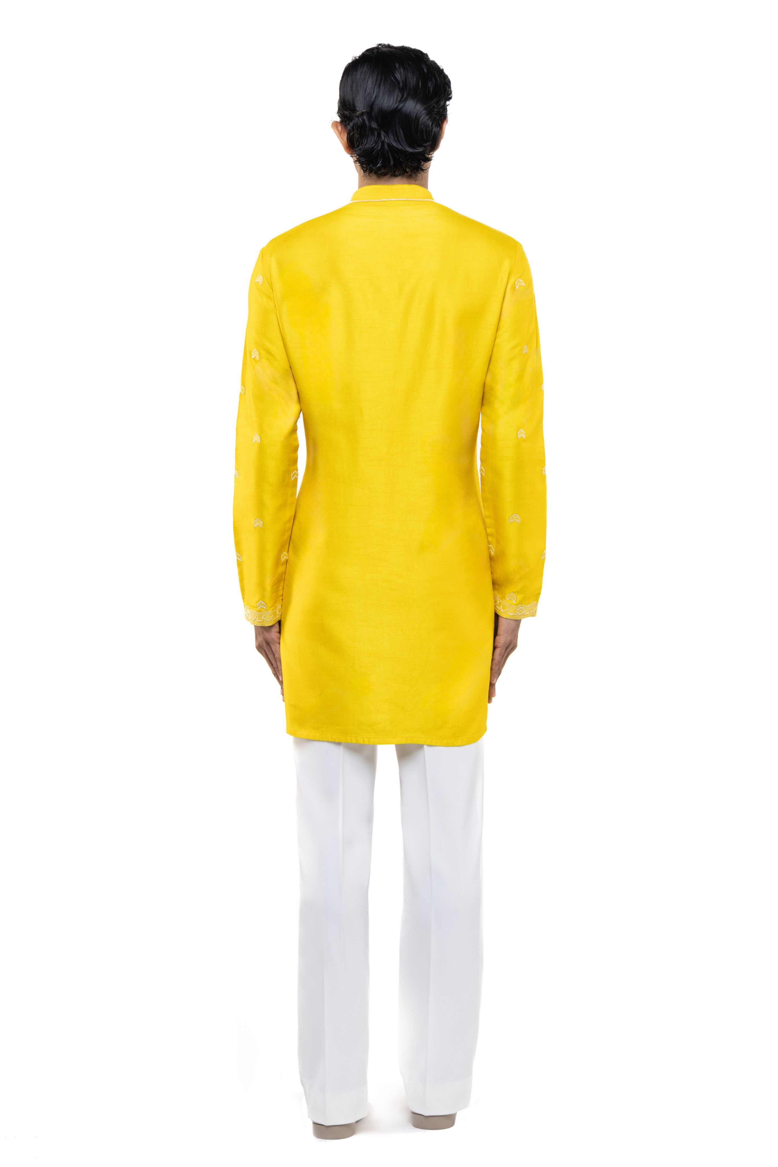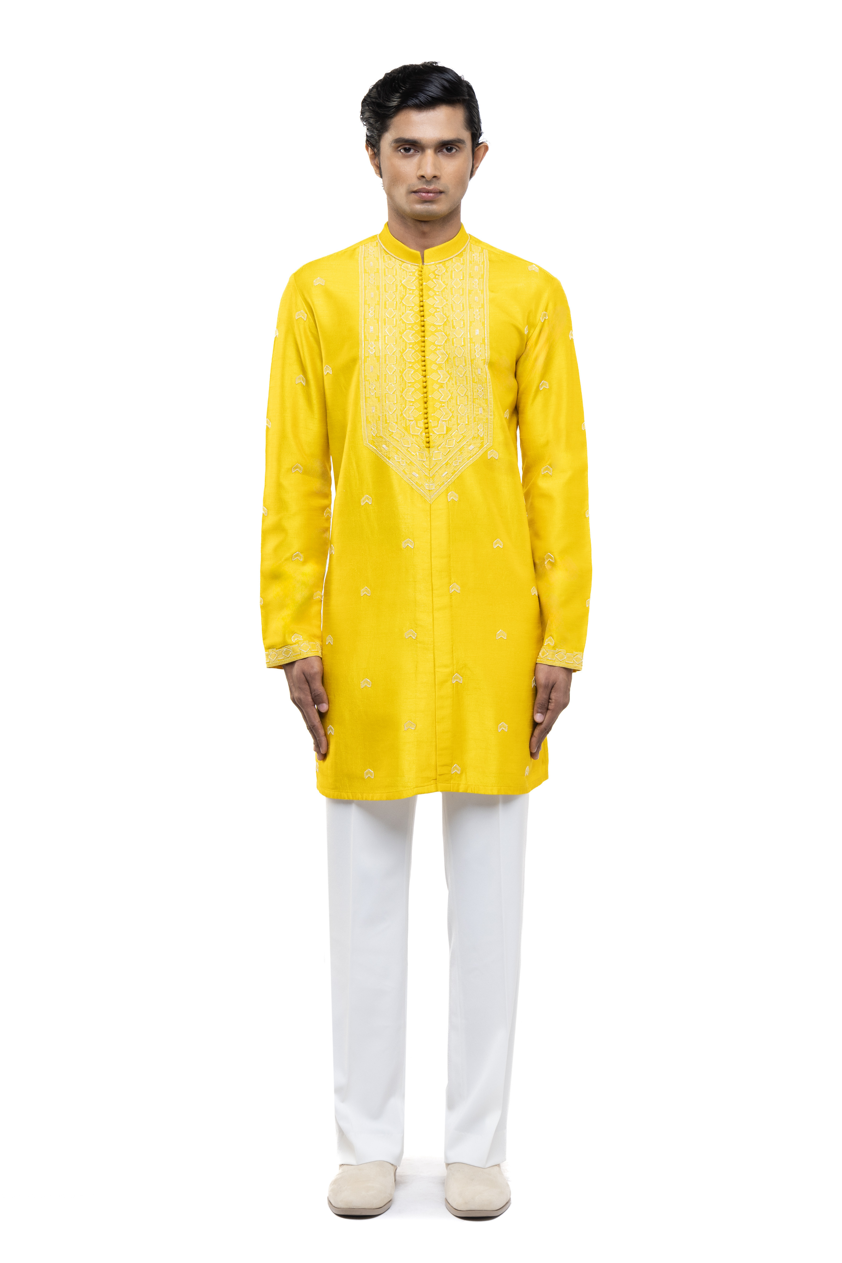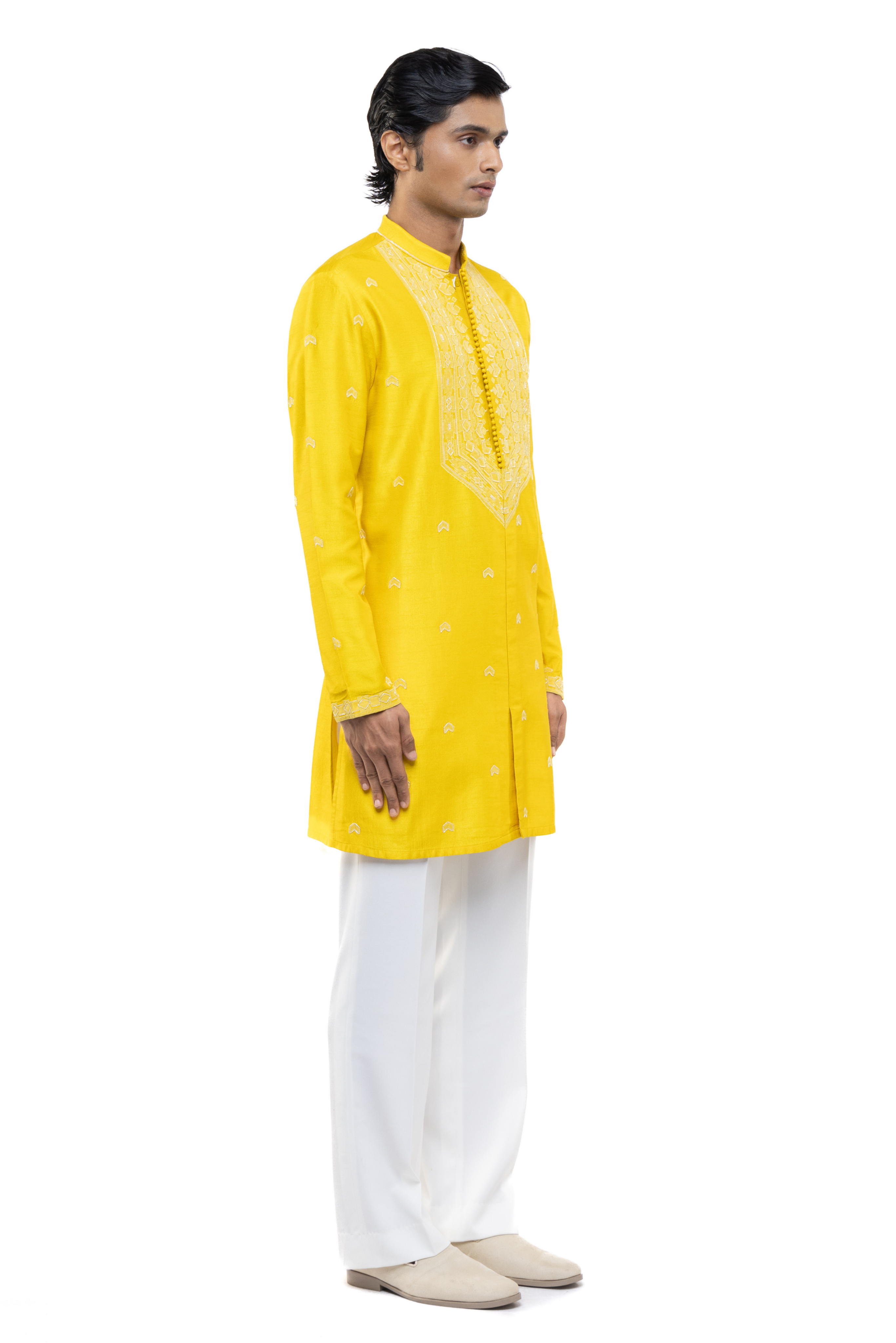 A yellow and white silk kurta set with hand embroidery, offering a traditional and elegant look for haldi, ethnic, and festive events.