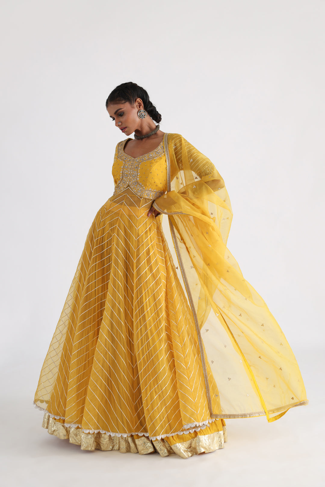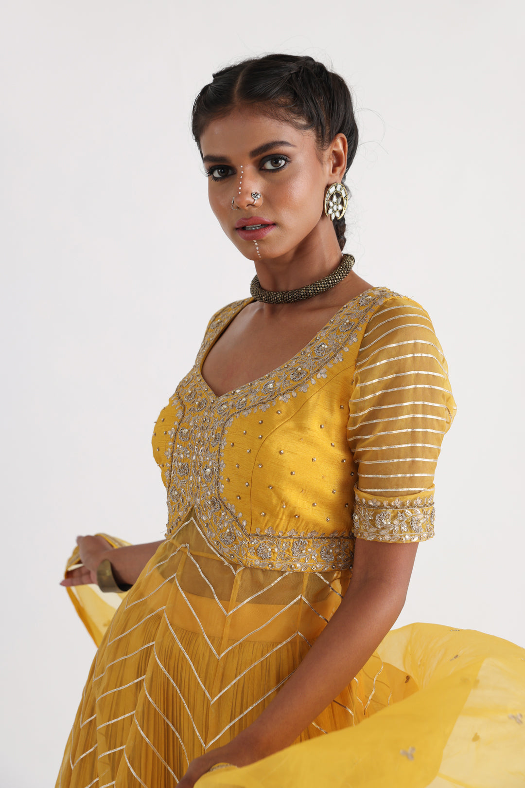 Get this yellow lehenga with an elegantly designed blouse that duals as a kurta. Crafted in fine fabric, further enhanced with sequins and zigzag lumpi lines. Intricately emroidered yoke is paired with a bam silk gathered skirt and organza dupatta.