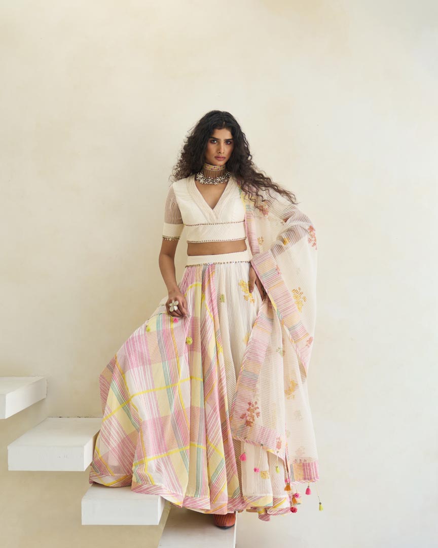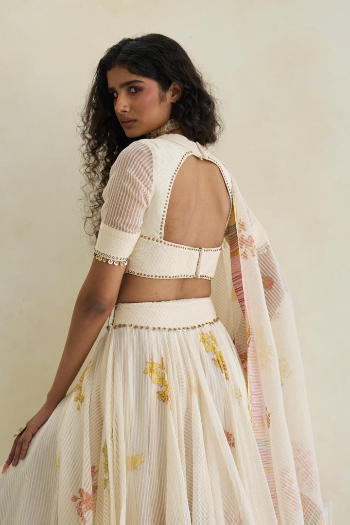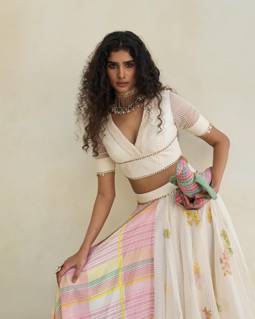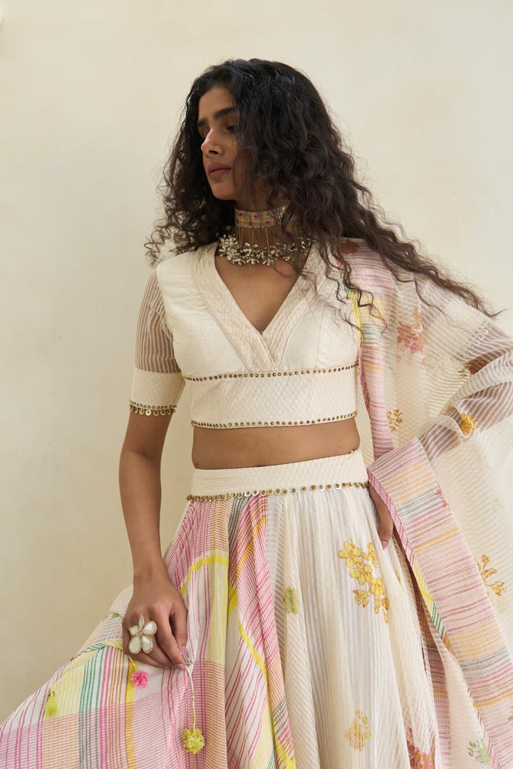 Hand block print V-neck blouse with a fabric-manipulated neckline, in woven striped silk organza and handwoven 60?gm Chanderi with 100% cotton lining, enhanced with beaded tassel work.